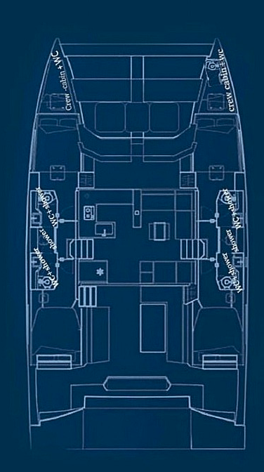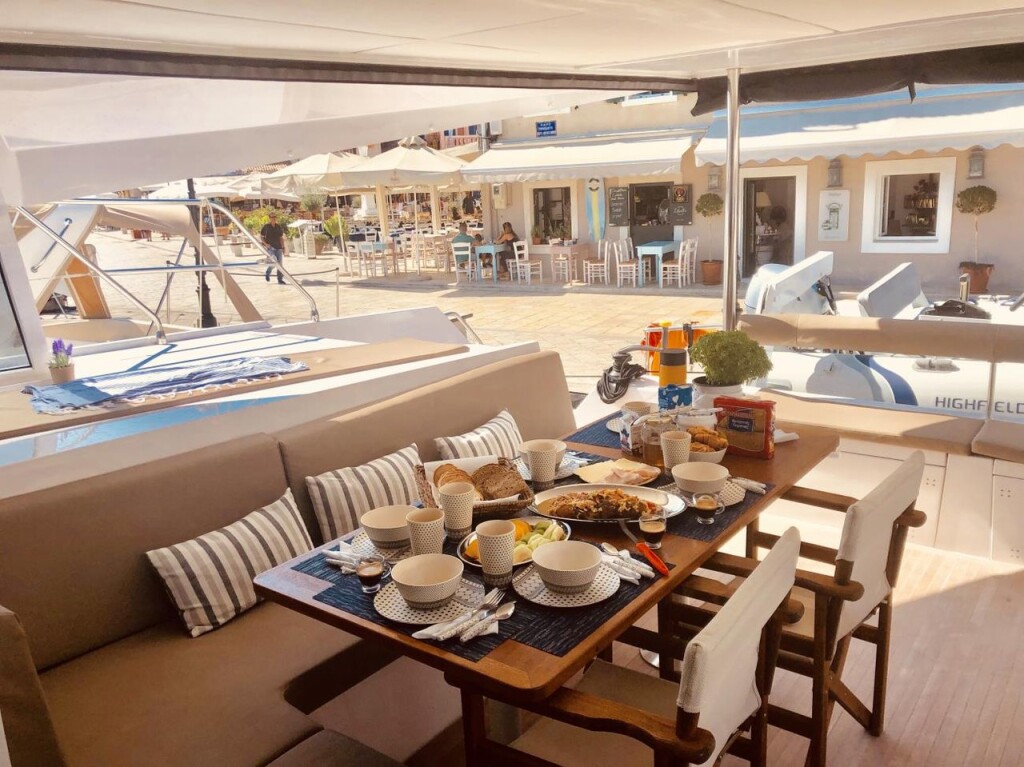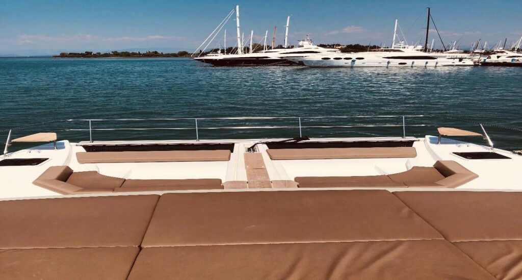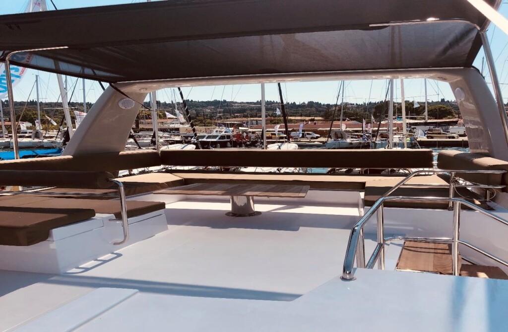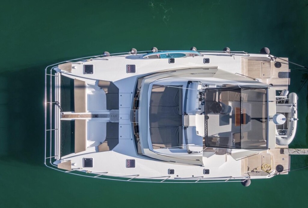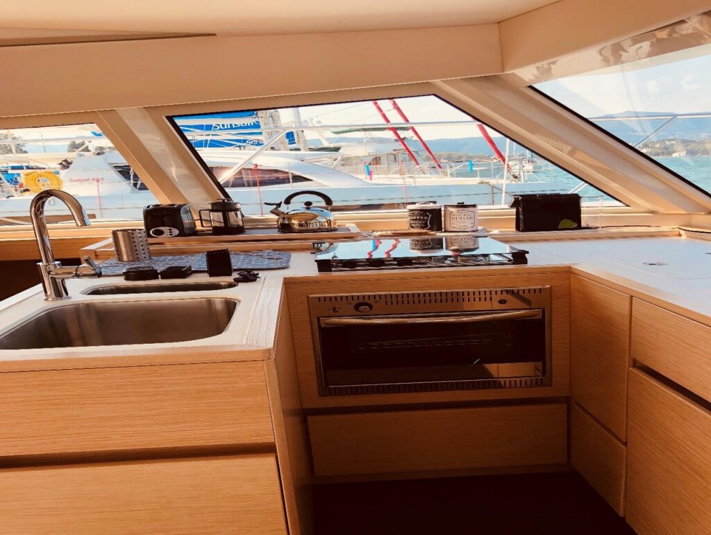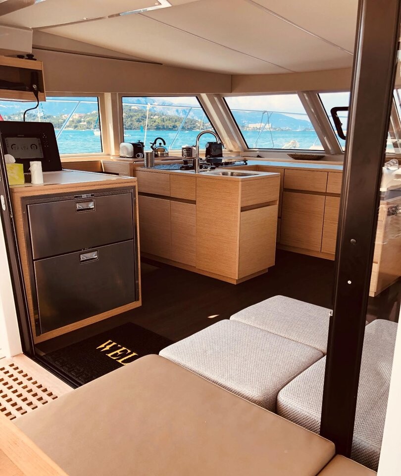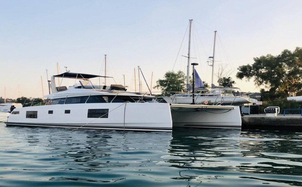 Power catamaran Nautitech 47 Power AG Princess, Baujahr 2019, liegt im Lefkas main port, Ionisches Meer, Griechenland vor Anker. Es verfügt über 4 + 2 Kabinen und bietet Platz für 8 + 2 Personen mit 4 + 1 Toiletten. Bettwäsche und Küchenausstattung sind im Preis inbegriffen.