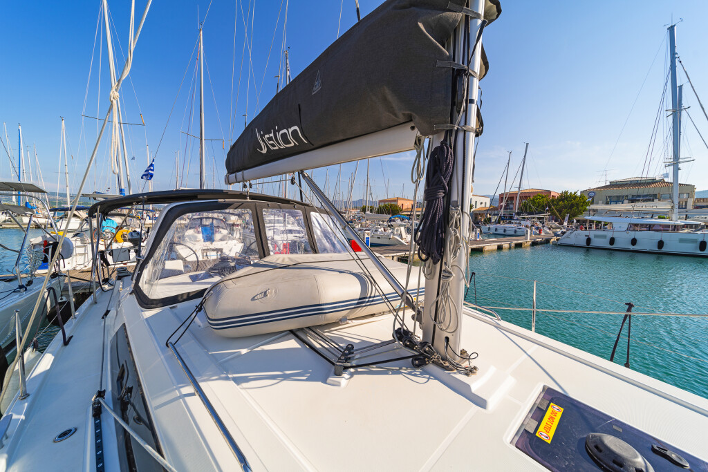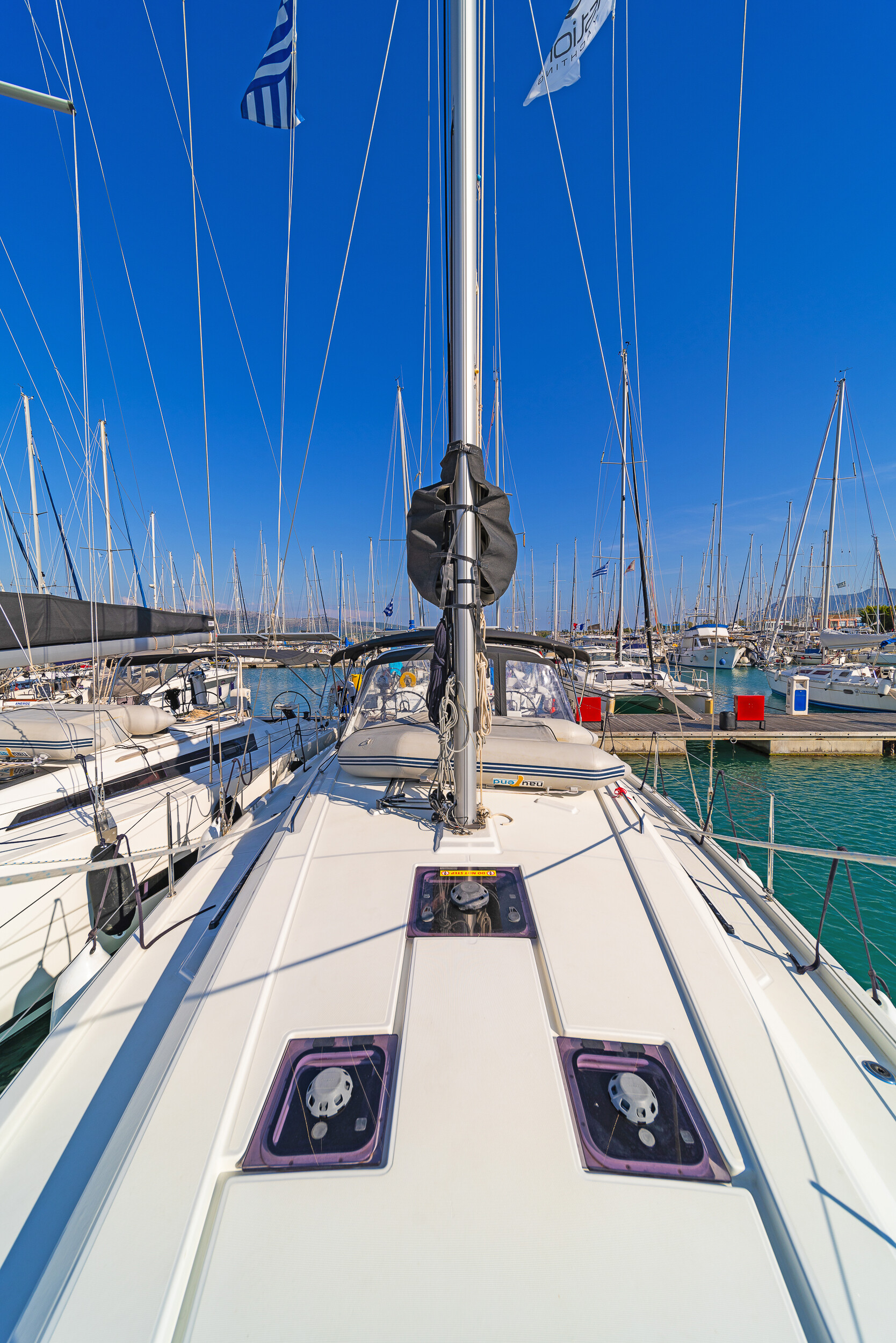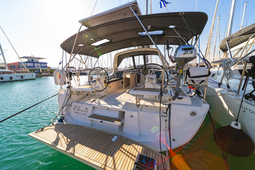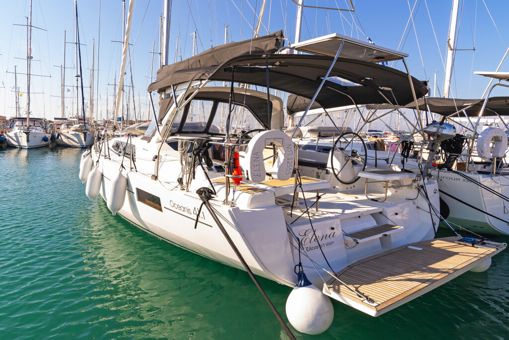 Segelyacht Oceanis 41.1 Elena, Baujahr 2020, liegt im Lefkas, D-Marin, Ionisches Meer, Griechenland vor Anker. Es verfügt über 3 Kabinen und bietet Platz für 6 Personen mit 2 Toiletten. Bettwäsche und Küchenausstattung sind im Preis inbegriffen.