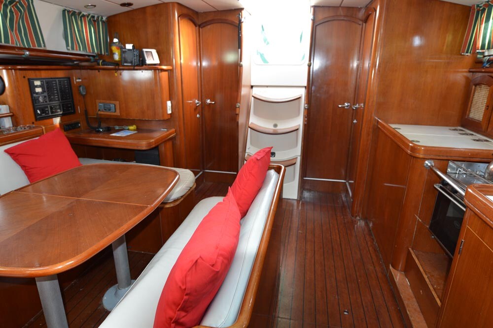 Segelyacht Oceanis Clipper 461 Seagull, Baujahr 1997, liegt im Athens, Alimos marina, Peloponnes, Griechenland vor Anker. Es verfügt über 4 Kabinen und bietet Platz für 8 + 2 Personen mit 2 Toiletten. Bettwäsche und Küchenausstattung sind im Preis inbegriffen.