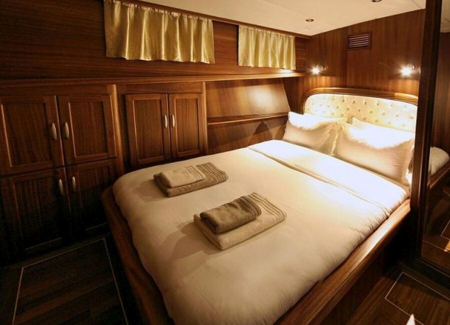 Gulet Remo Remo, Baujahr 1986, liegt im Bodrum, Milta Marina, Aegean, Türkei vor Anker. Es verfügt über 3 Kabinen und bietet Platz für 6 Personen mit 3 Toiletten. Bettwäsche und Küchenausstattung sind im Preis inbegriffen.