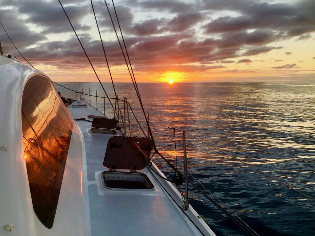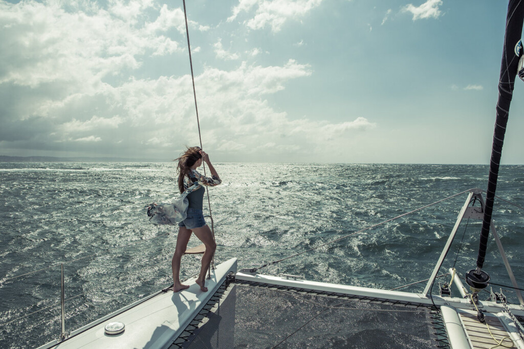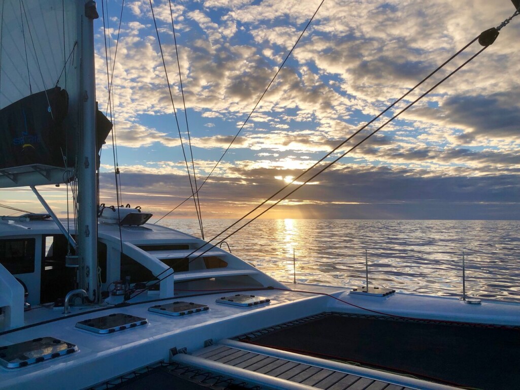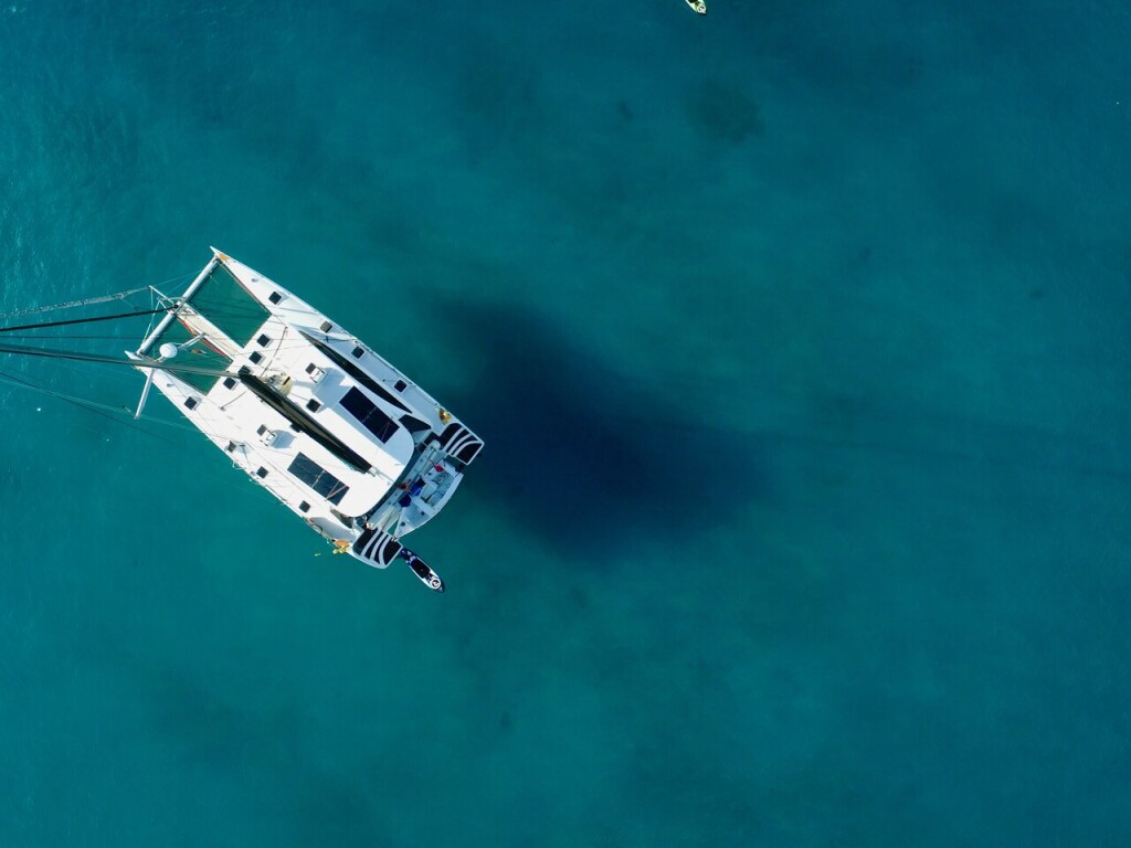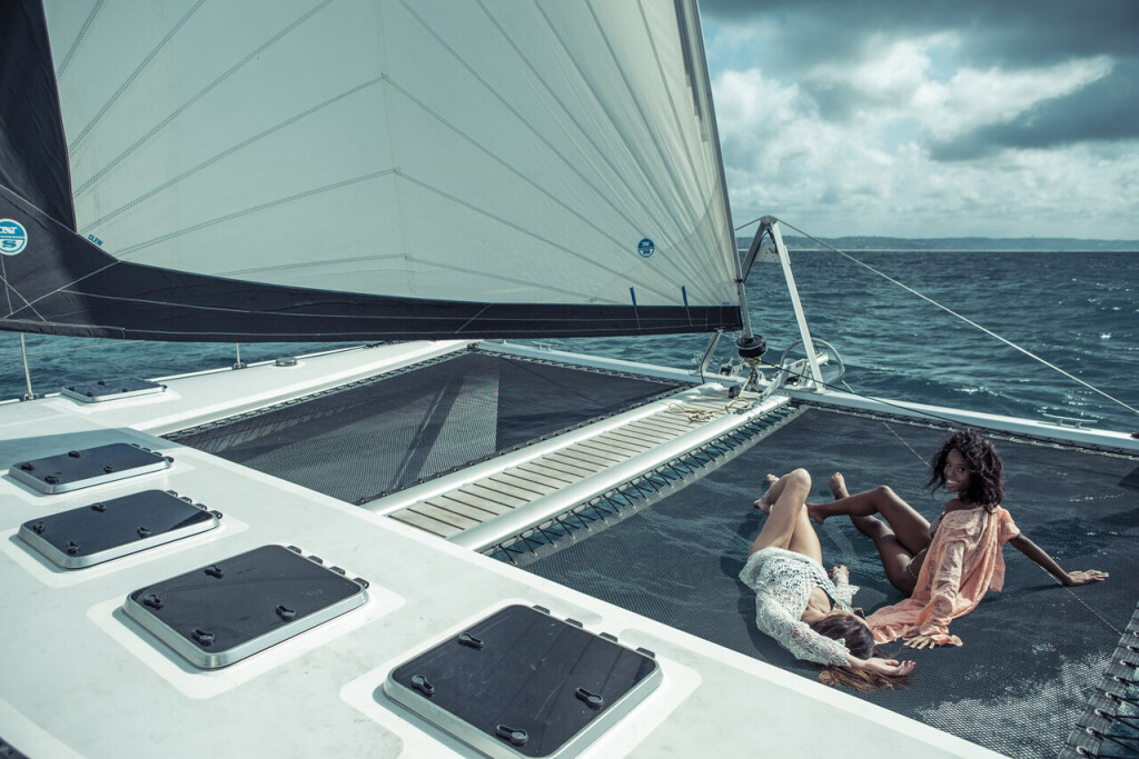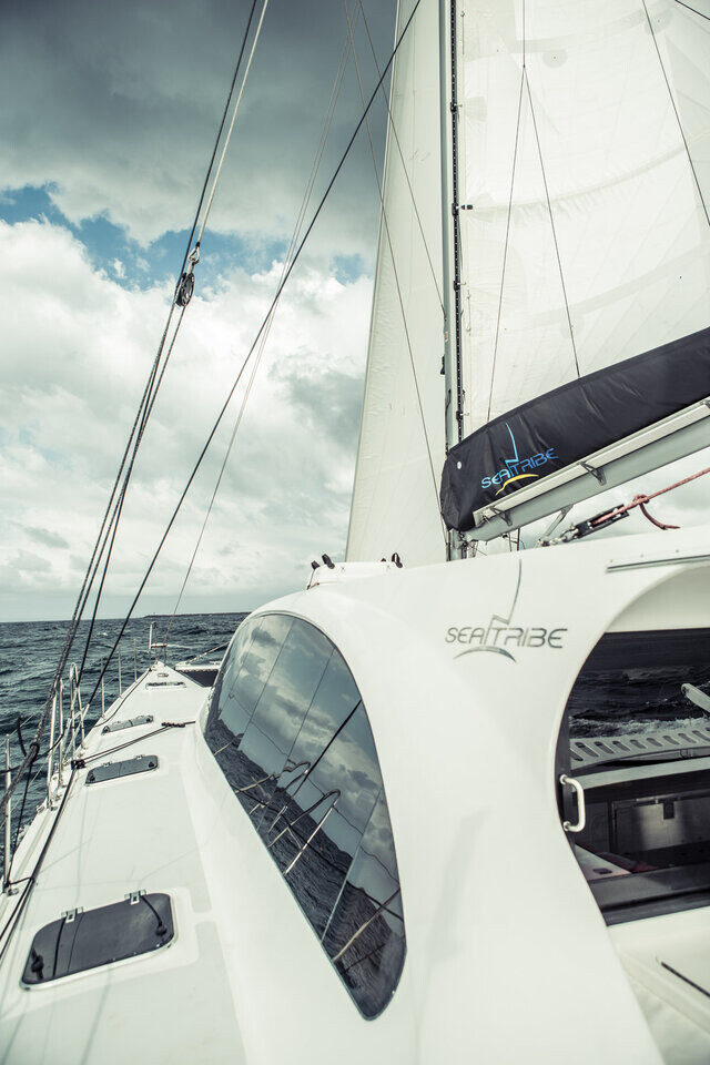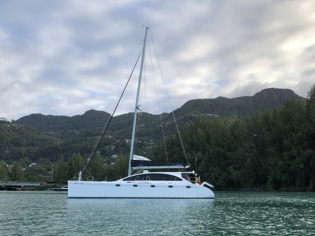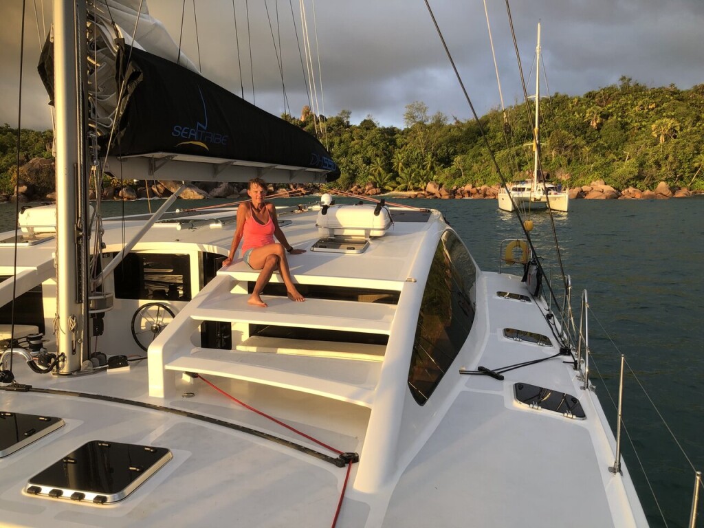 Katamaran Sea-Tribe DH550 Valerie, Baujahr 2019, liegt im Seychelles, Mahe, Mahé, Seychellen vor Anker. Es verfügt über 4 + 2 Kabinen und bietet Platz für 8 + 2 Personen mit 4 Toiletten. Bettwäsche und Küchenausstattung sind im Preis inbegriffen.
