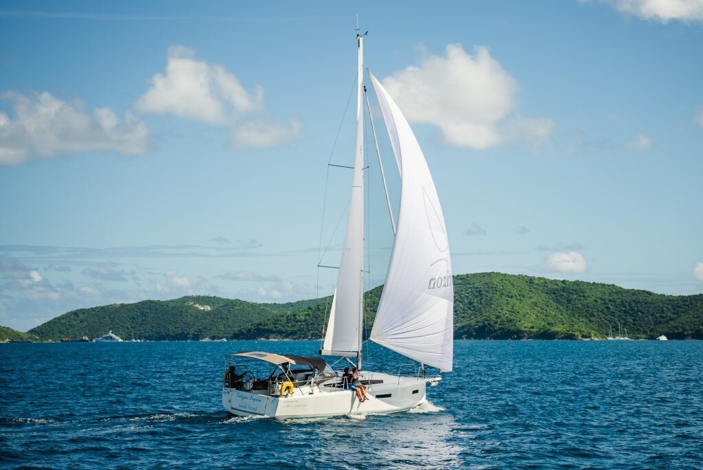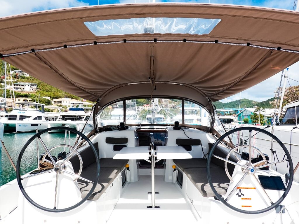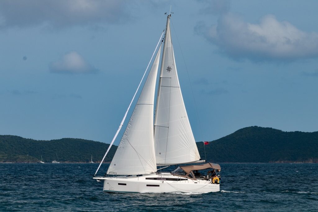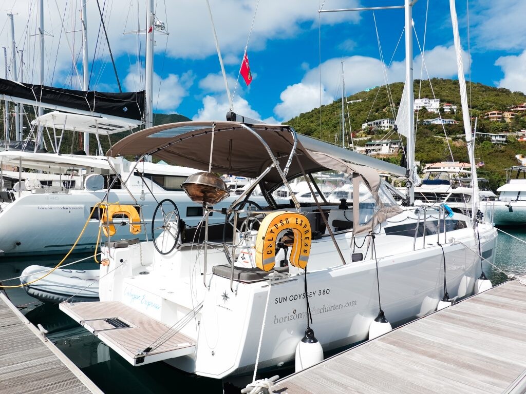 Segelyacht Sun Odyssey 380 Calypso Express, Baujahr 2024, liegt im BVI, Tortola, Nanny Cay Marina, British Virgin Islands, Britische Jungferninseln (BVI) vor Anker. Es verfügt über 3 Kabinen und bietet Platz für 6 Personen mit 2 Toiletten. Bettwäsche und Küchenausstattung sind im Preis inbegriffen.