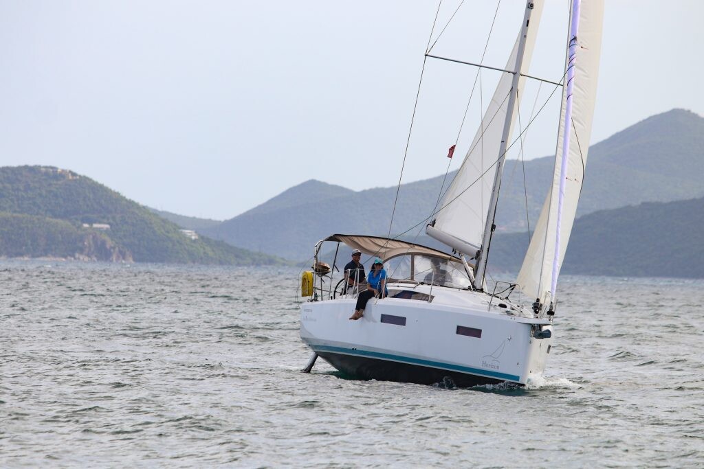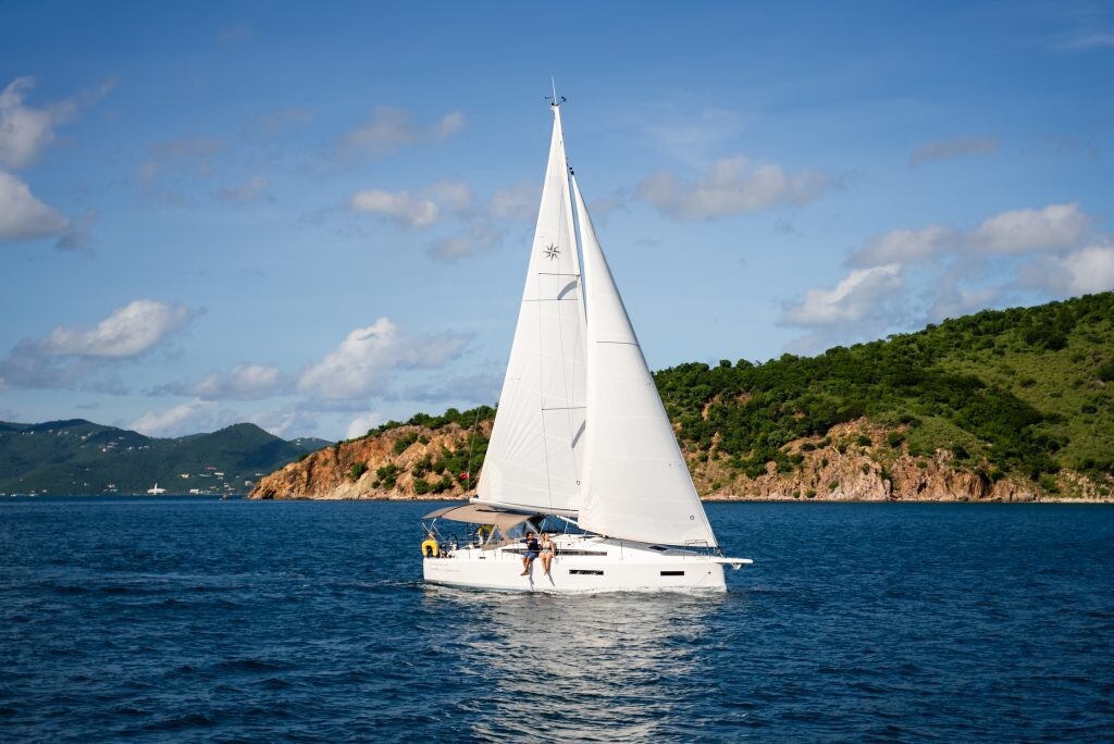 Segelyacht Sun Odyssey 380 Soca Sleigh, Baujahr 2024, liegt im BVI, Tortola, Nanny Cay Marina, British Virgin Islands, Britische Jungferninseln (BVI) vor Anker. Es verfügt über 2 Kabinen und bietet Platz für 4 Personen mit 2 Toiletten. Bettwäsche und Küchenausstattung sind im Preis inbegriffen.