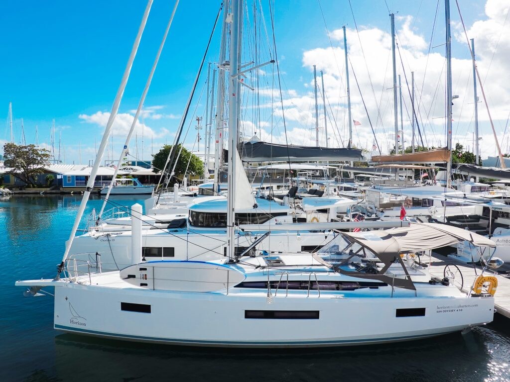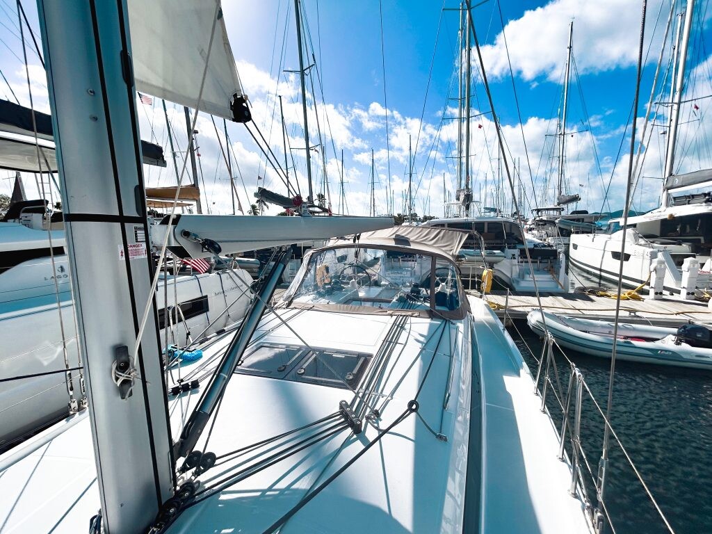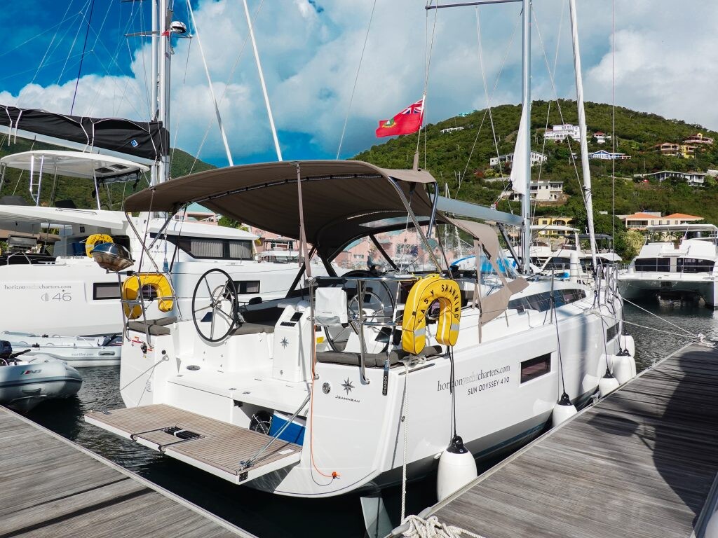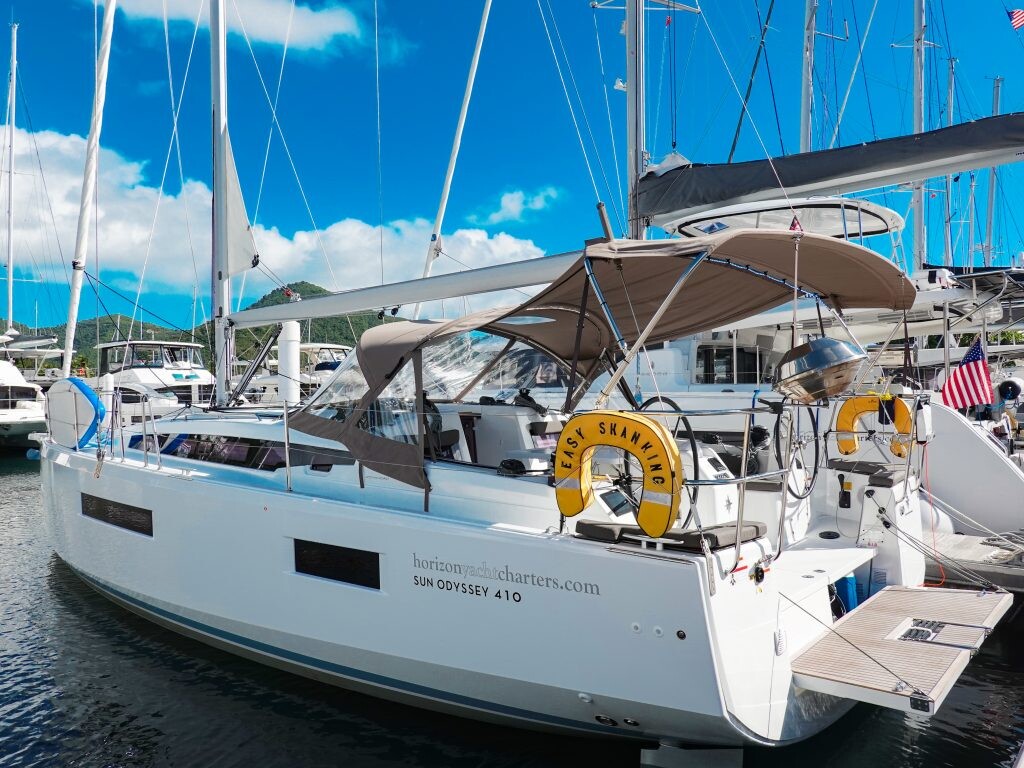 Segelyacht Sun Odyssey 410 Easy Skanking, Baujahr 2024, liegt im BVI, Tortola, Nanny Cay Marina, British Virgin Islands, Britische Jungferninseln (BVI) vor Anker. Es verfügt über 3 Kabinen und bietet Platz für 6 Personen mit 2 Toiletten. Bettwäsche und Küchenausstattung sind im Preis inbegriffen.
