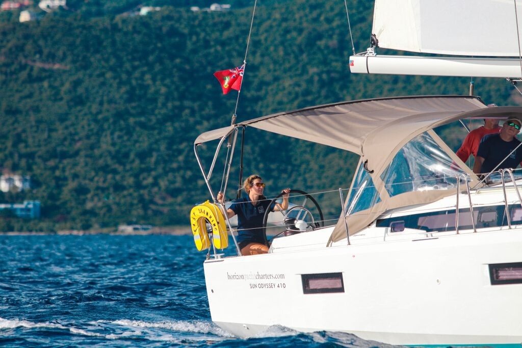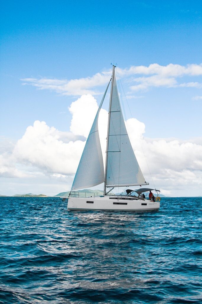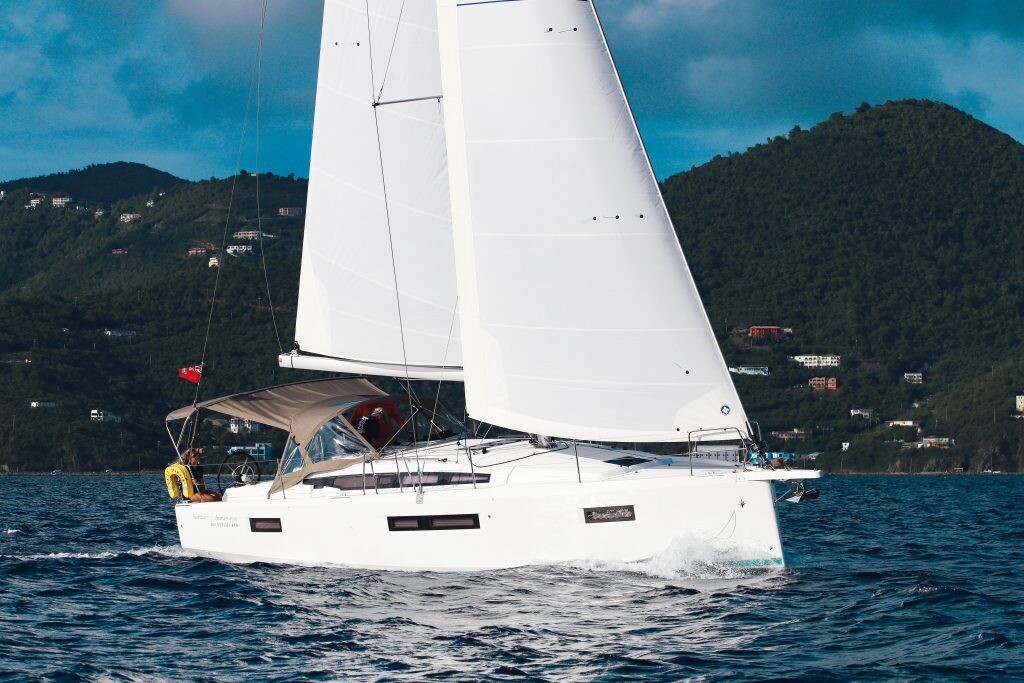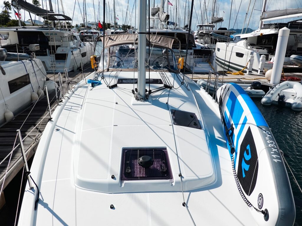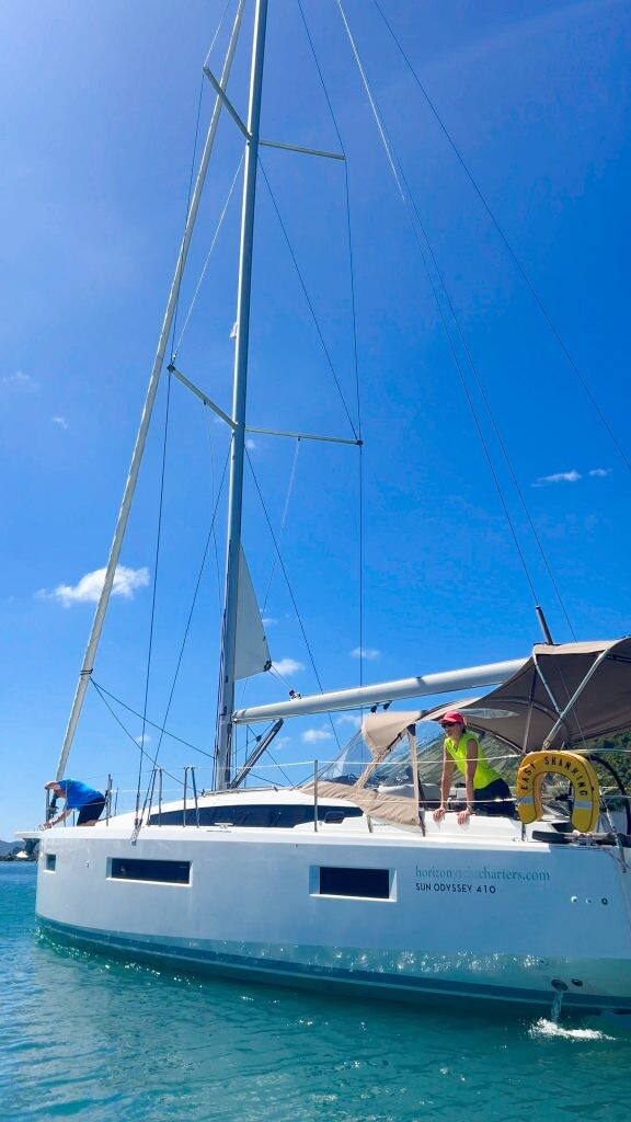 Segelyacht Sun Odyssey 410 Easy Skanking, Baujahr 2024, liegt im BVI, Tortola, Nanny Cay Marina, British Virgin Islands, Britische Jungferninseln (BVI) vor Anker. Es verfügt über 3 Kabinen und bietet Platz für 6 Personen mit 2 Toiletten. Bettwäsche und Küchenausstattung sind im Preis inbegriffen.