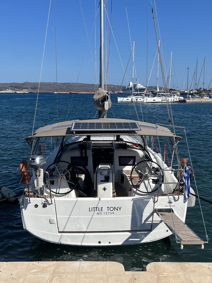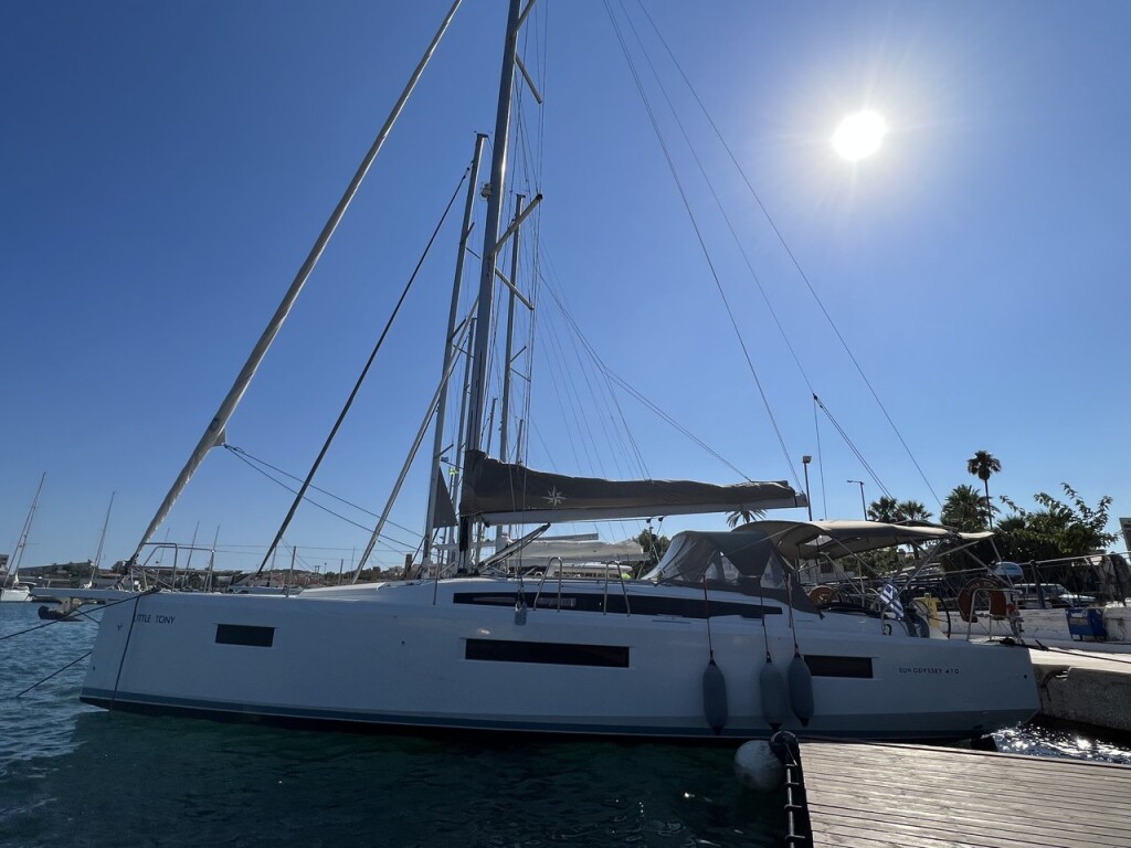 Segelyacht Sun Odyssey 410 Little Tony, Baujahr 2021, liegt im Athens, Alimos marina, Peloponnes, Griechenland vor Anker. Es verfügt über 3 Kabinen und bietet Platz für 6 + 2 Personen mit 2 Toiletten. Bettwäsche und Küchenausstattung sind im Preis inbegriffen.