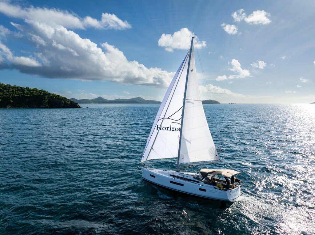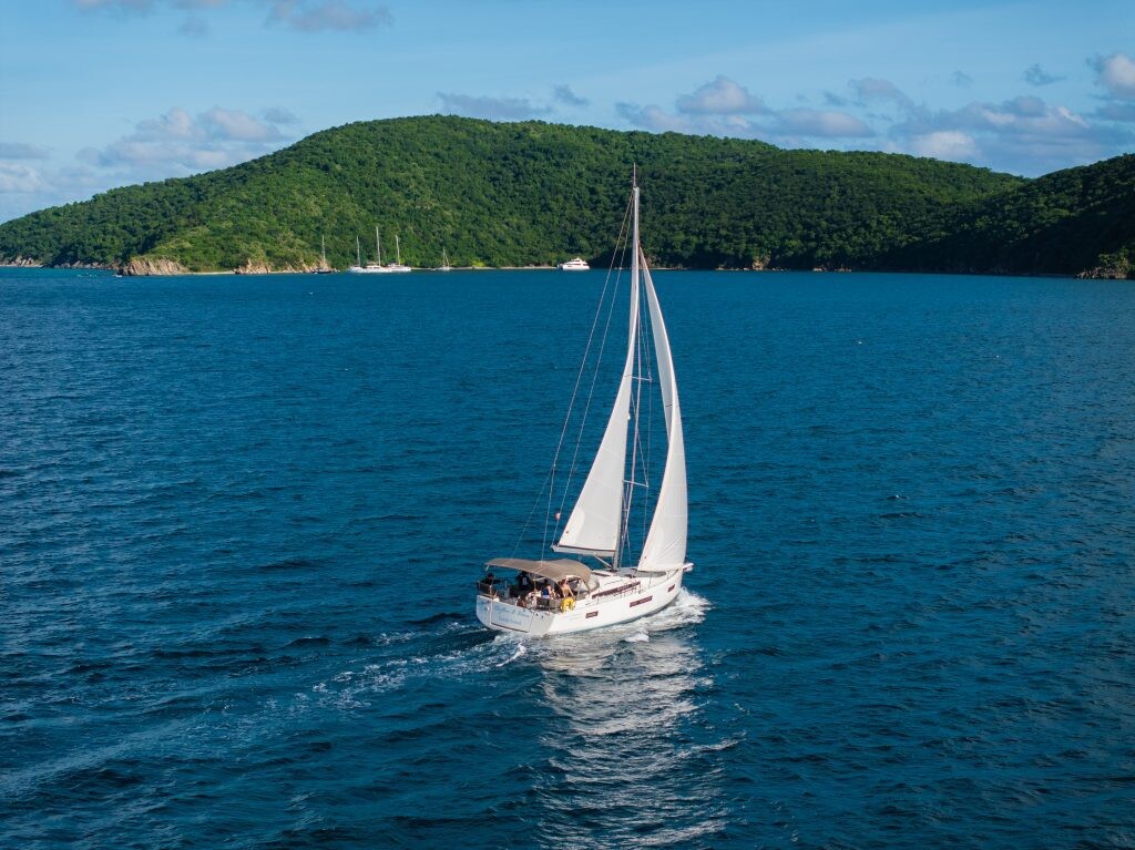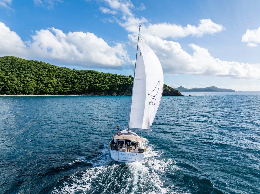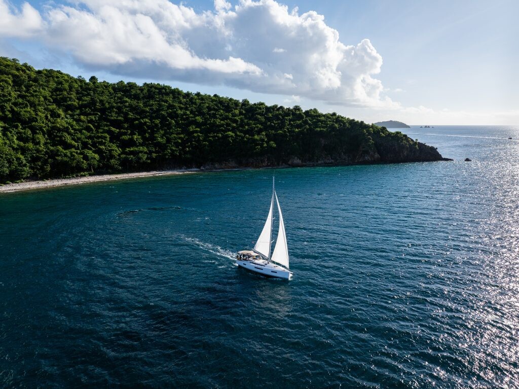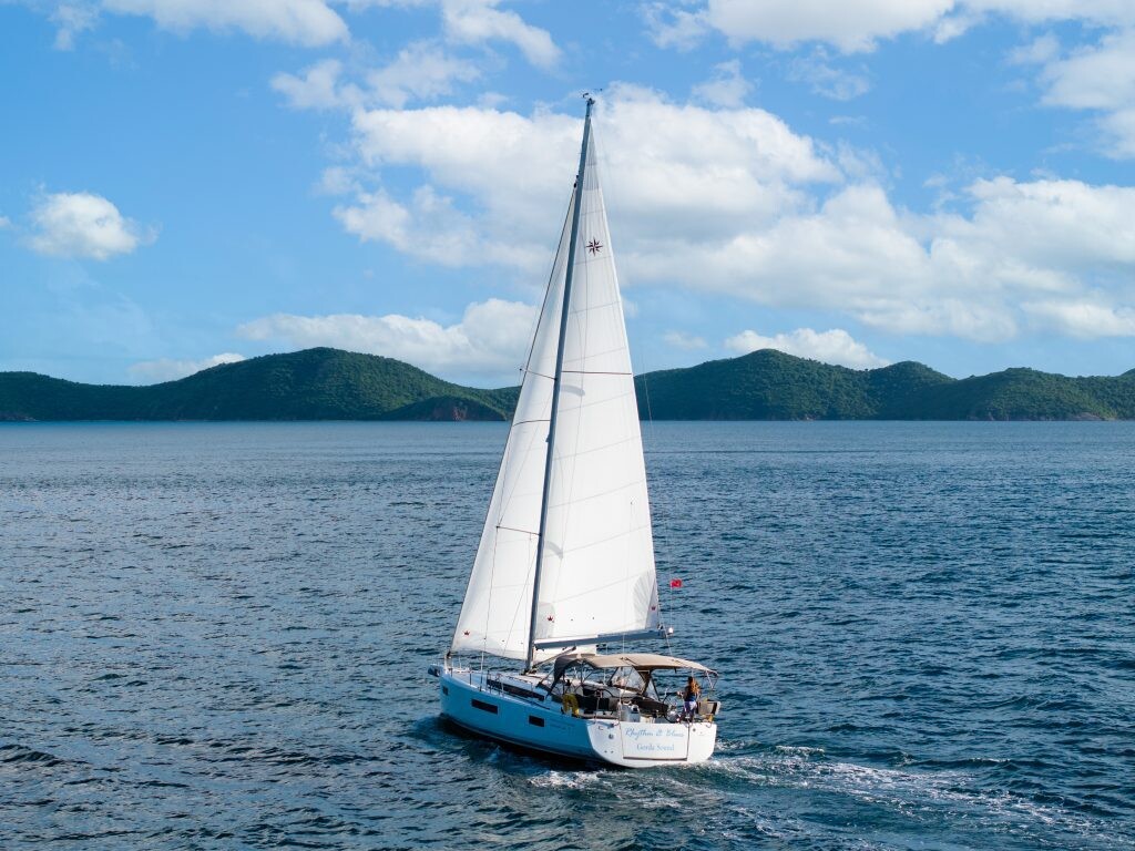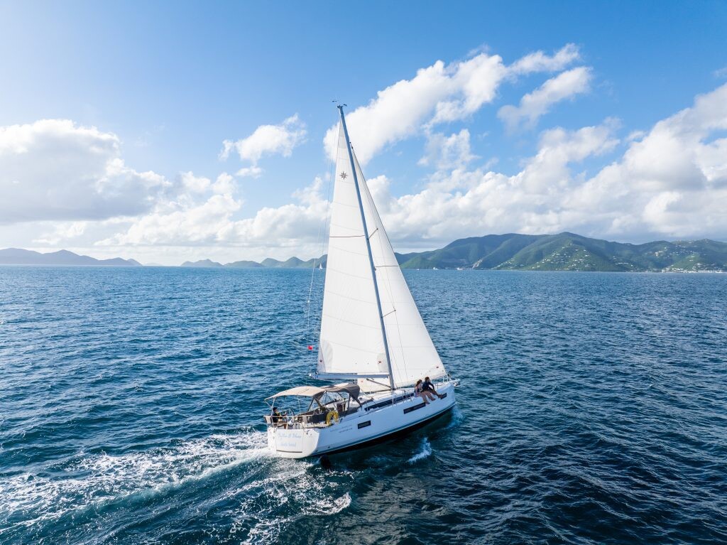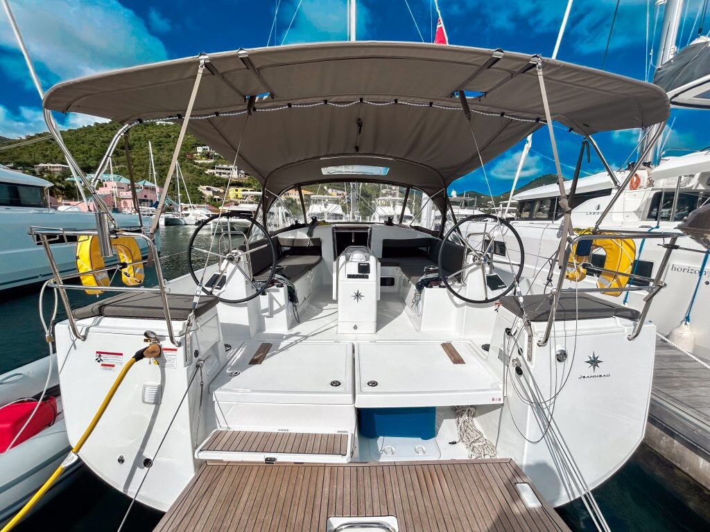 Segelyacht Sun Odyssey 440 Rhythm & Blues, Baujahr 2024, liegt im BVI, Tortola, Nanny Cay Marina, British Virgin Islands, Britische Jungferninseln (BVI) vor Anker. Es verfügt über 3 Kabinen und bietet Platz für 6 Personen mit 2 Toiletten. Bettwäsche und Küchenausstattung sind im Preis inbegriffen.