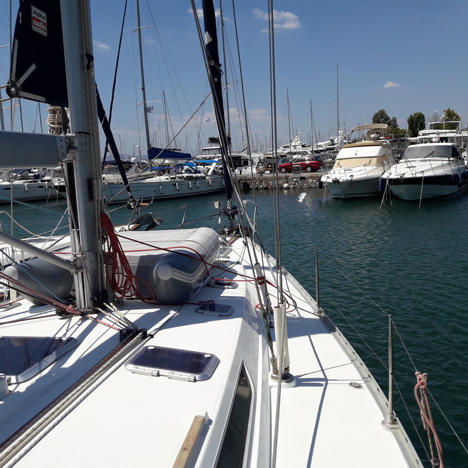 Segelyacht Sun Odyssey 52.2 Hesiodos, Baujahr 2000, liegt im Athens, Alimos marina, Peloponnes, Griechenland vor Anker. Es verfügt über 5 Kabinen und bietet Platz für 10 + 2 Personen mit 5 Toiletten. Bettwäsche und Küchenausstattung sind im Preis inbegriffen.