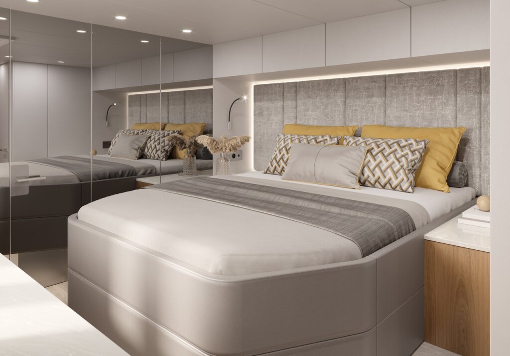 Katamaran Sunreef 50 Zara, Baujahr 2023, liegt im Marina Kastela, Split & Umgebung, Kroatien vor Anker. Es verfügt über 4 + 1 Kabinen und bietet Platz für 8 + 1 Personen mit 4 + 1 Toiletten. Bettwäsche und Küchenausstattung sind im Preis inbegriffen.