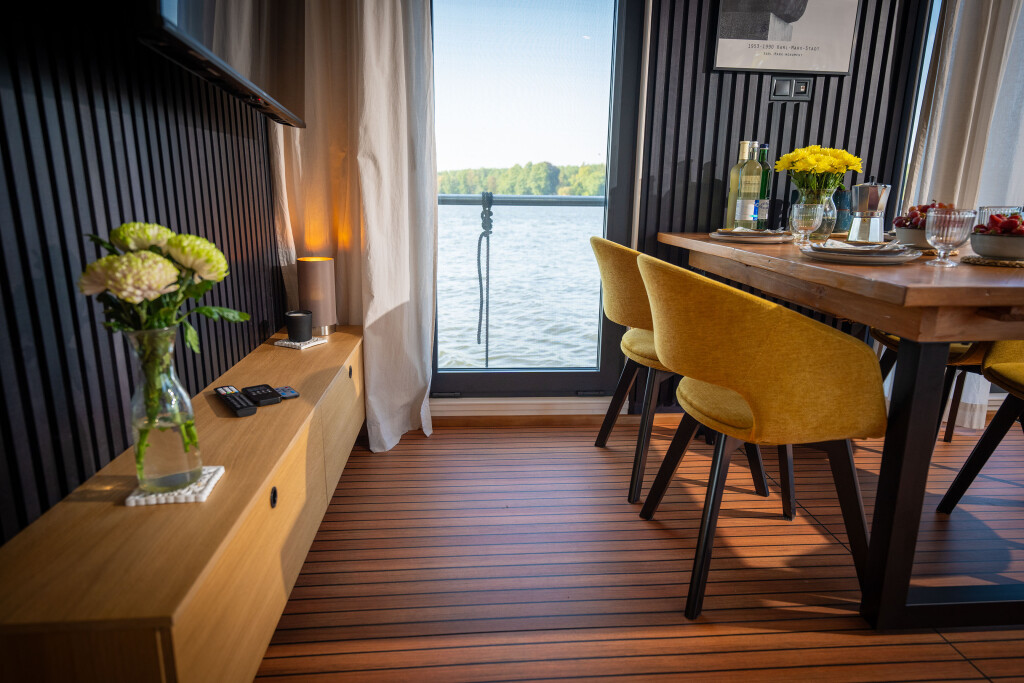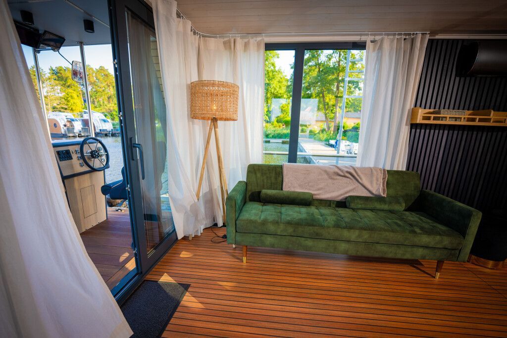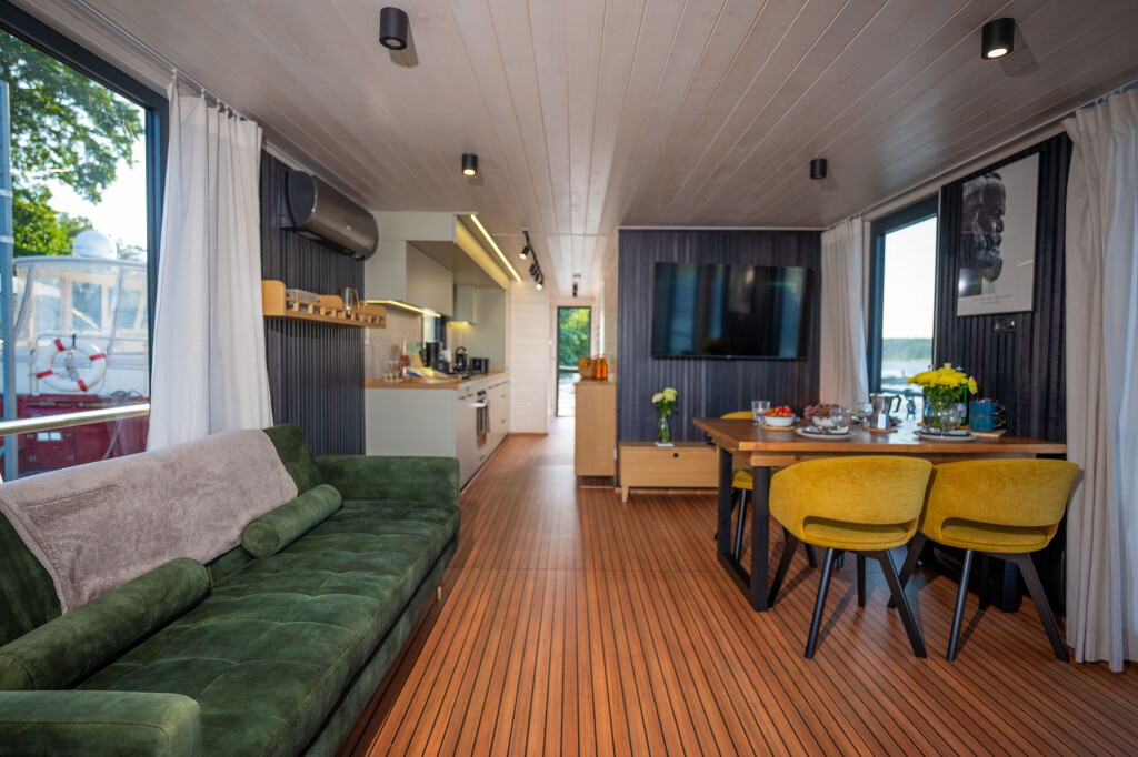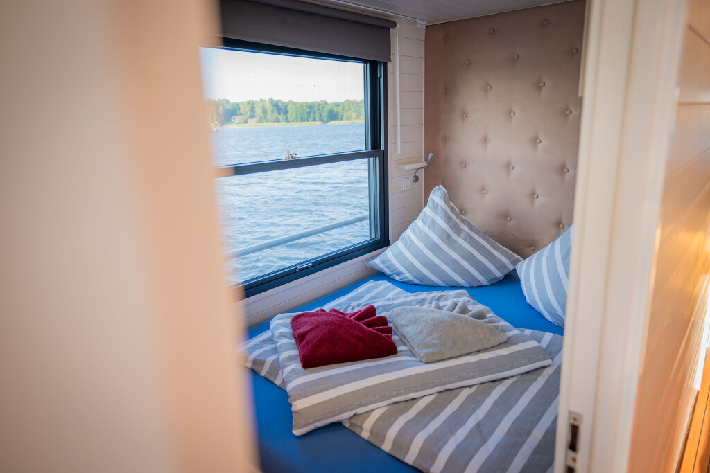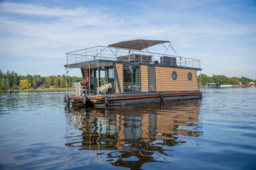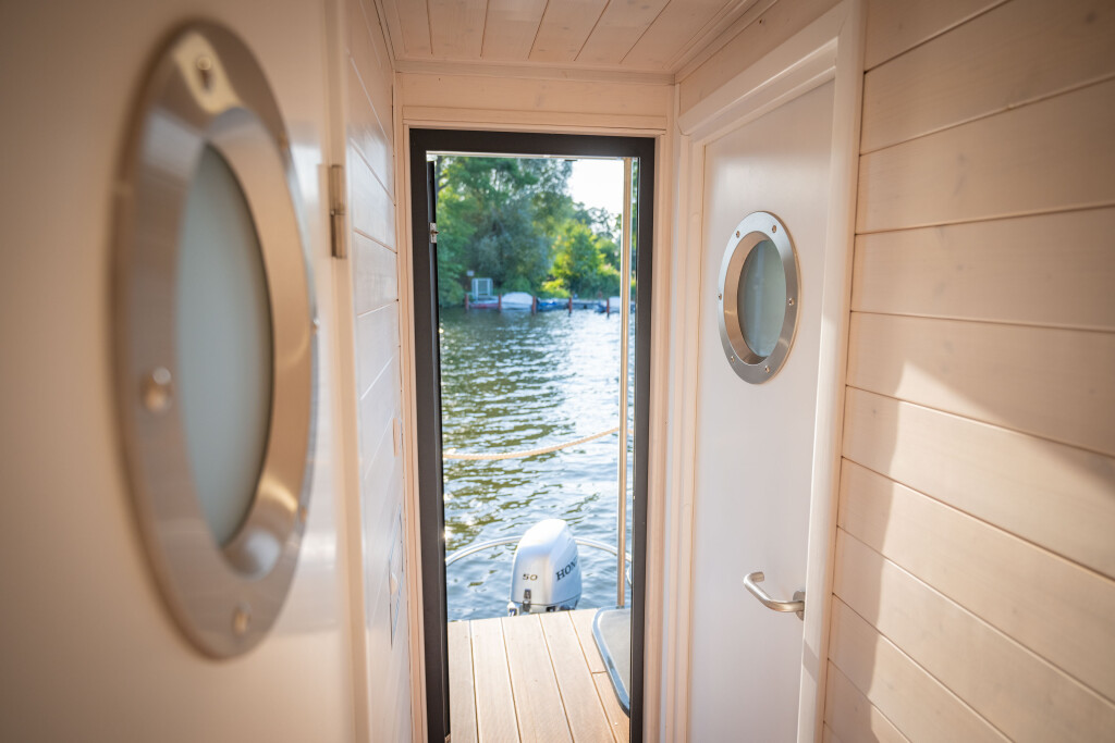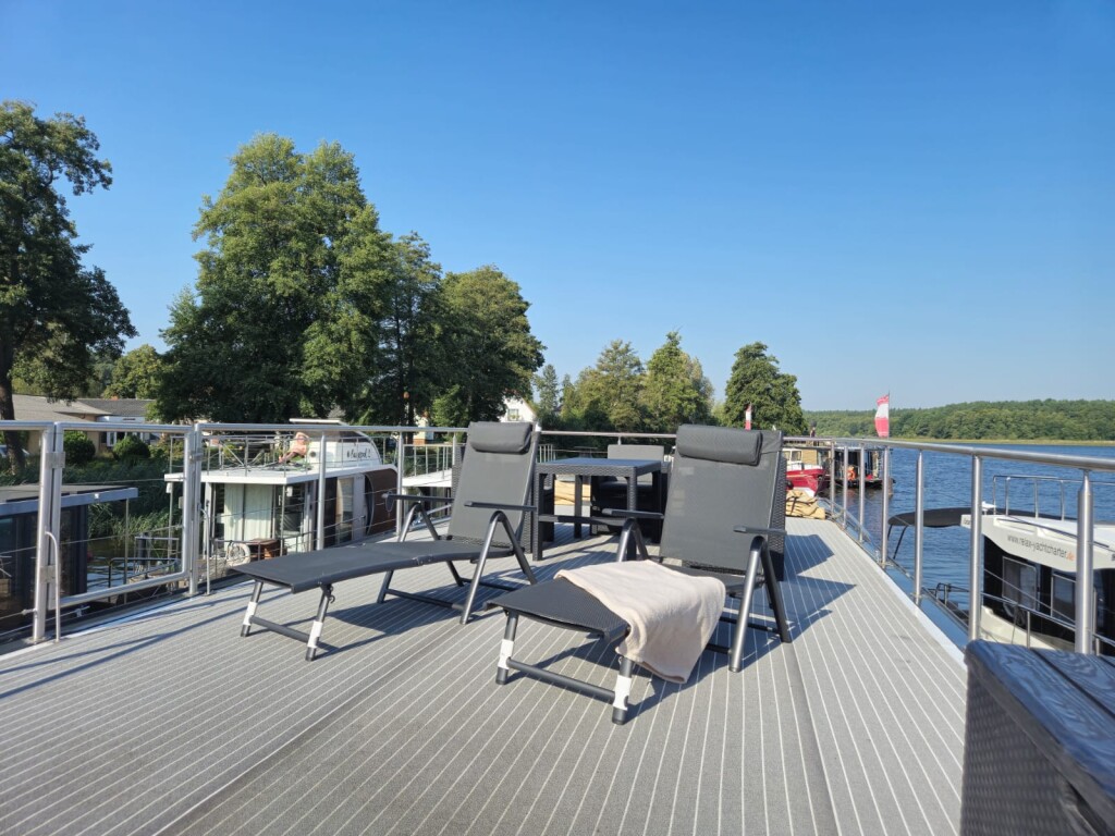 Hausboote Woma D13 Emsel, Baujahr 2024, liegt im Röblinsee Marina, Brandenburg, Deutschland vor Anker. Es verfügt über 2 Kabinen und bietet Platz für 4 + 2 Personen mit 1 Toiletten. Bettwäsche und Küchenausstattung sind im Preis inbegriffen.