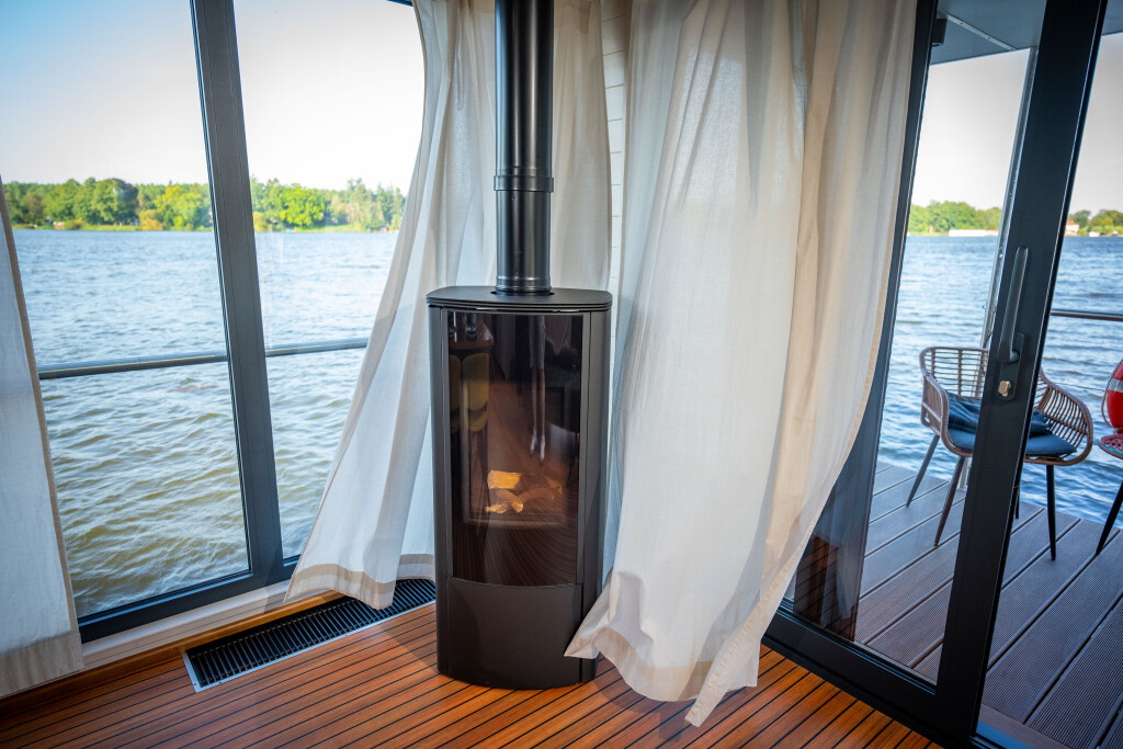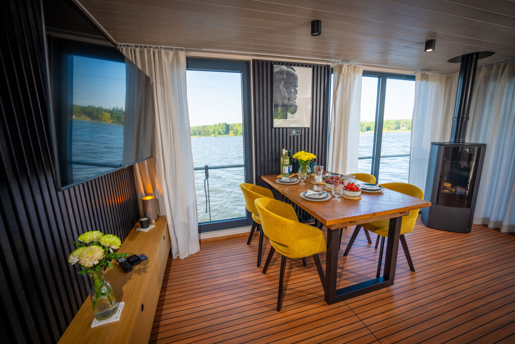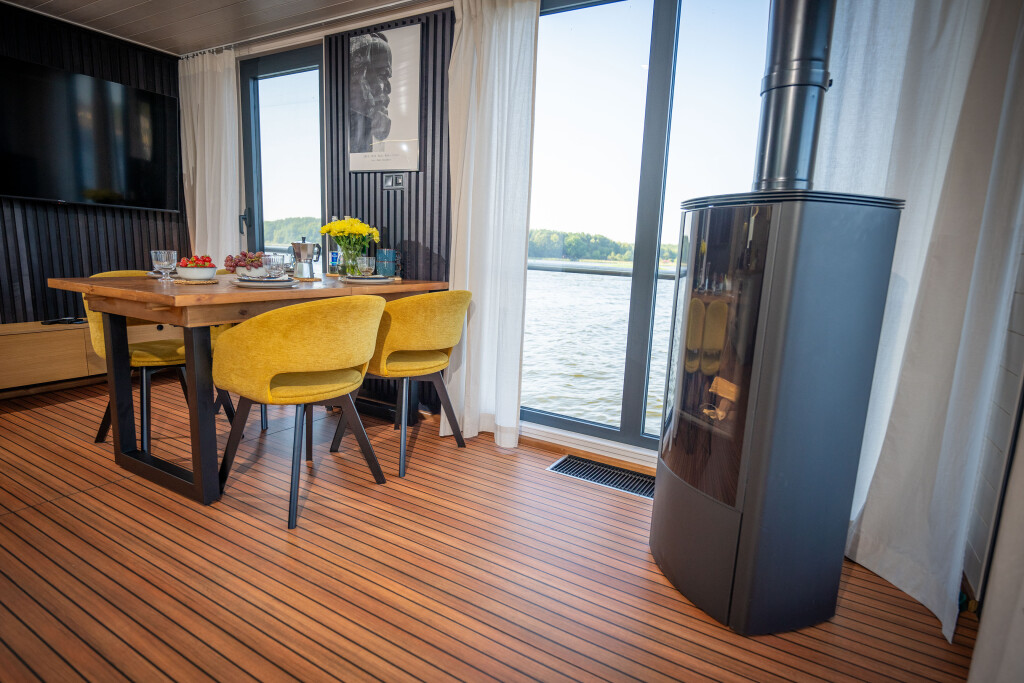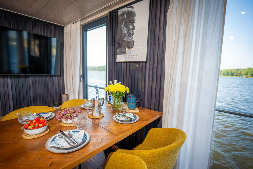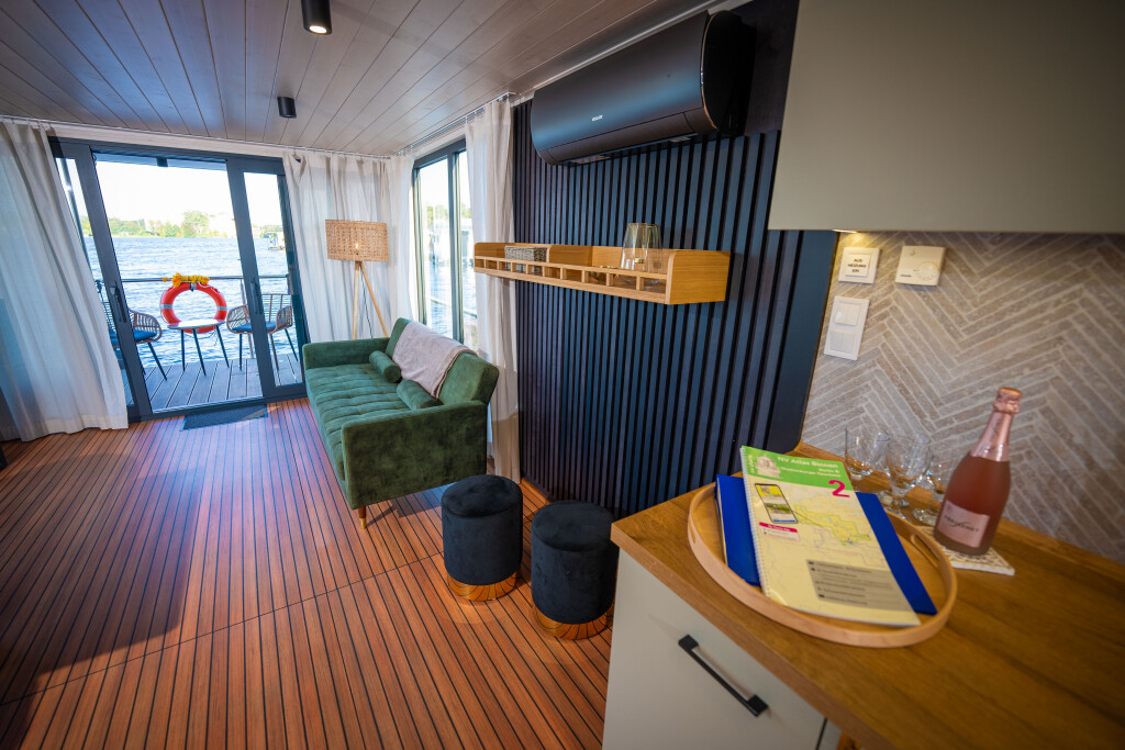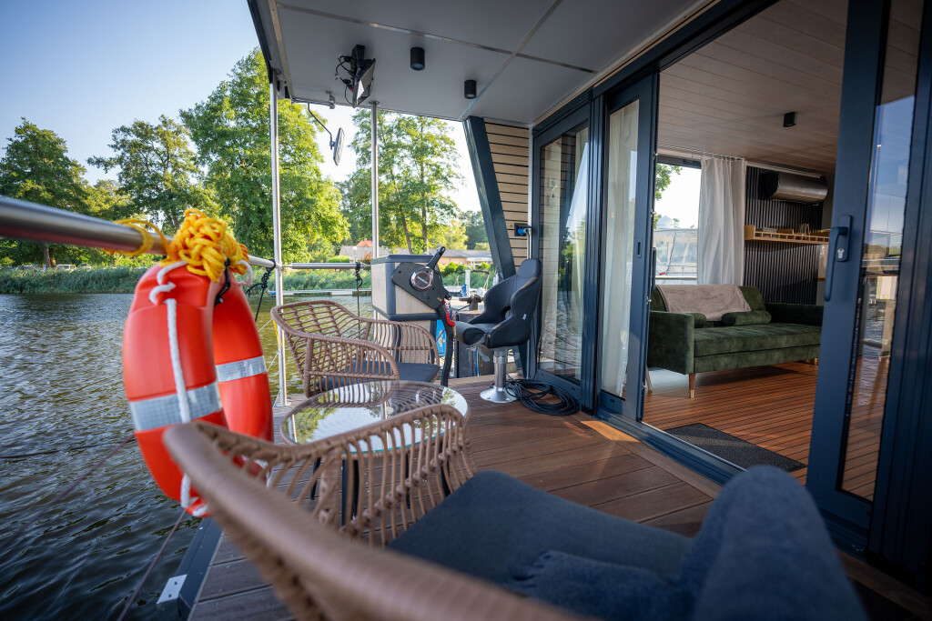 Hausboote Woma D13 Emsel, Baujahr 2024, liegt im Röblinsee Marina, Brandenburg, Deutschland vor Anker. Es verfügt über 2 Kabinen und bietet Platz für 4 + 2 Personen mit 1 Toiletten. Bettwäsche und Küchenausstattung sind im Preis inbegriffen.