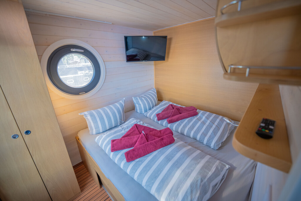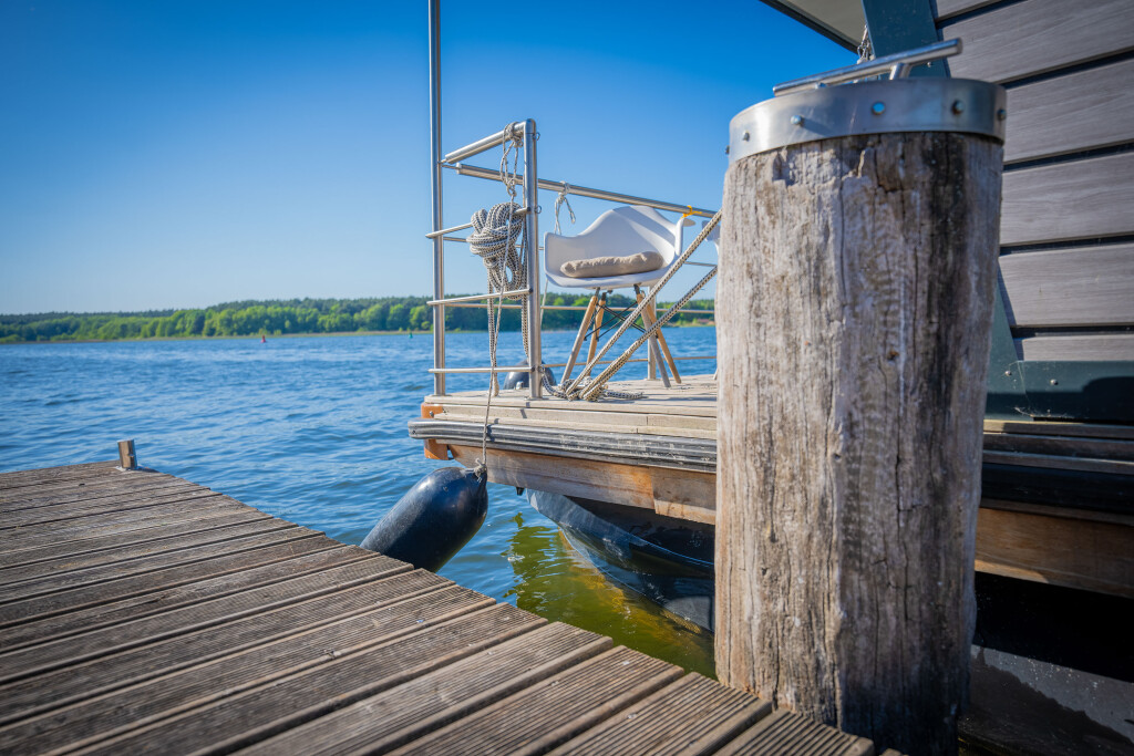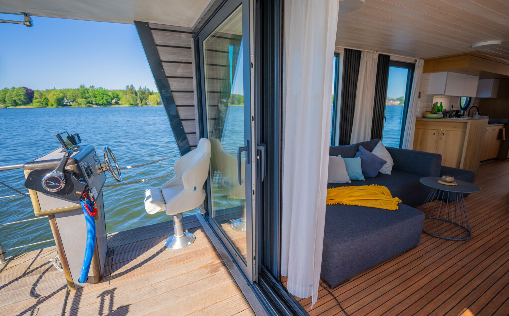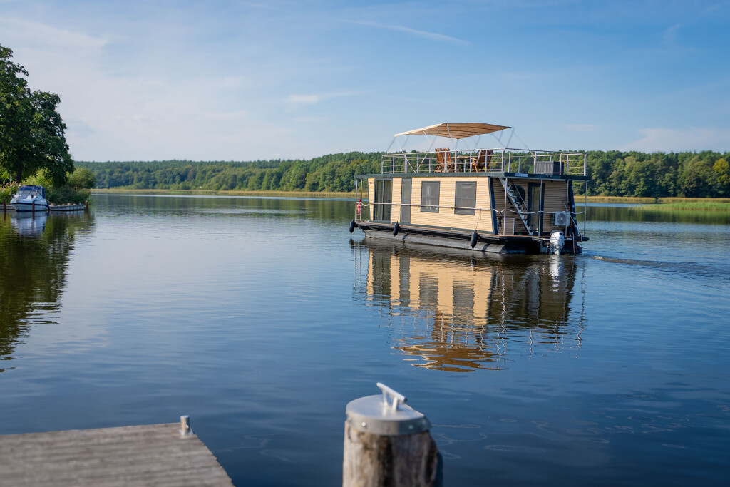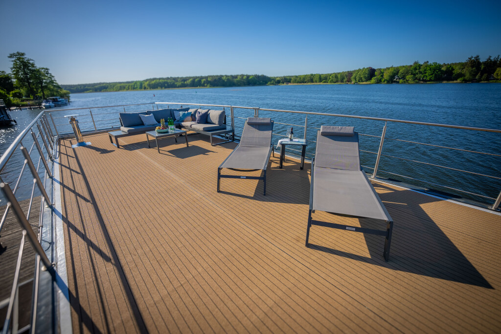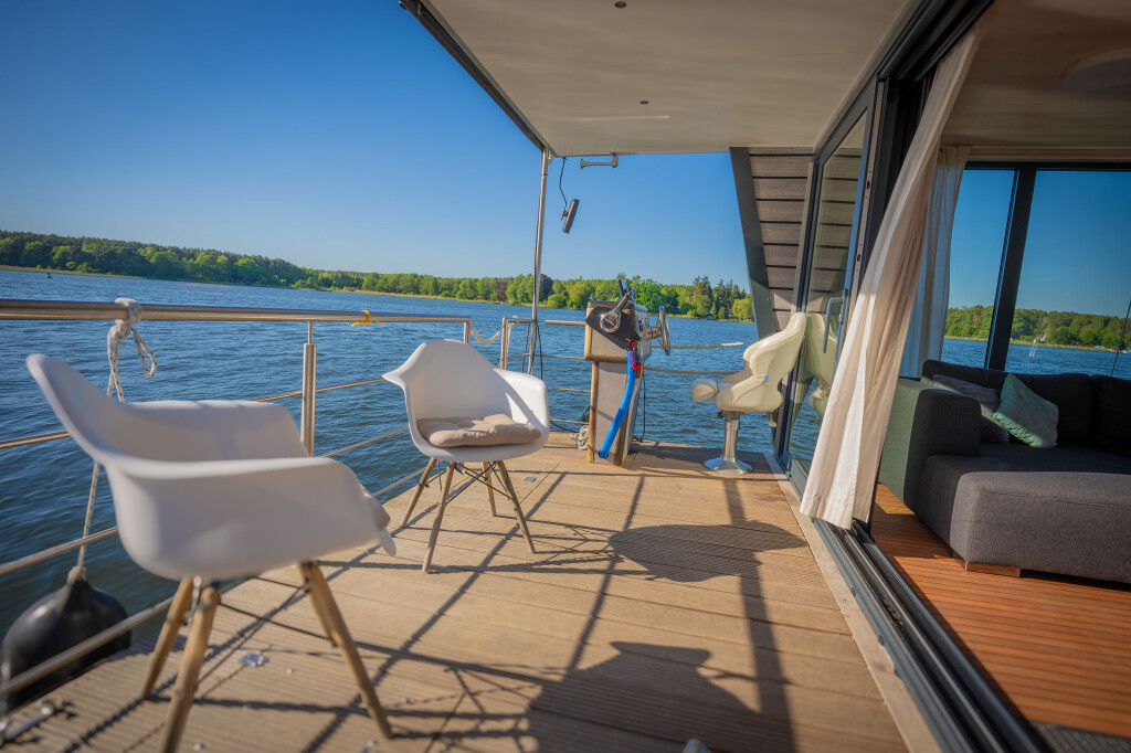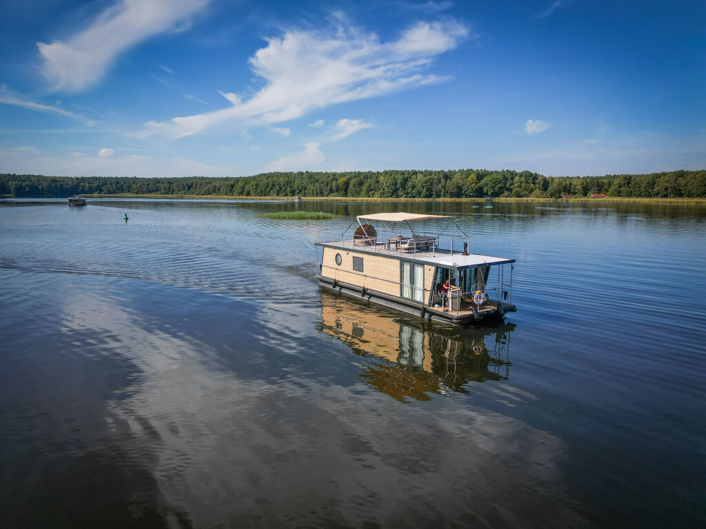 Hausboote Woma D13 Juno, Baujahr 2022, liegt im Röblinsee Marina, Brandenburg, Deutschland vor Anker. Es verfügt über 2 Kabinen und bietet Platz für 7 Personen mit 1 Toiletten. Bettwäsche und Küchenausstattung sind im Preis inbegriffen.