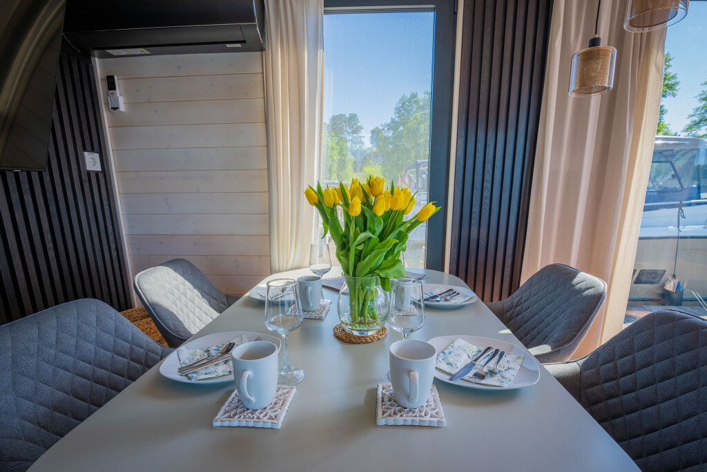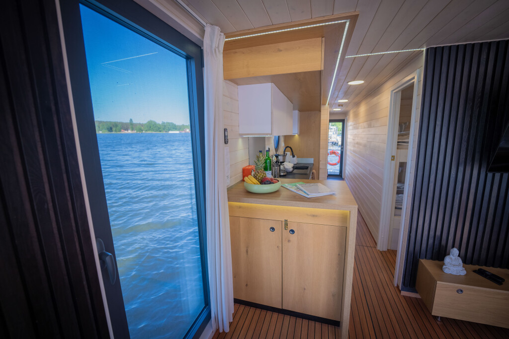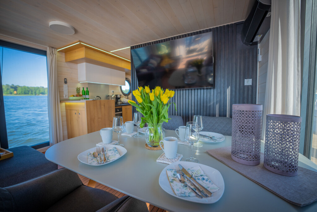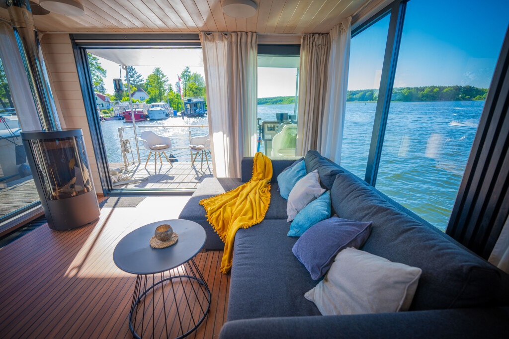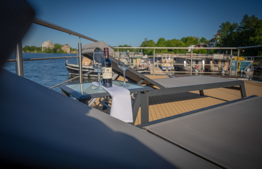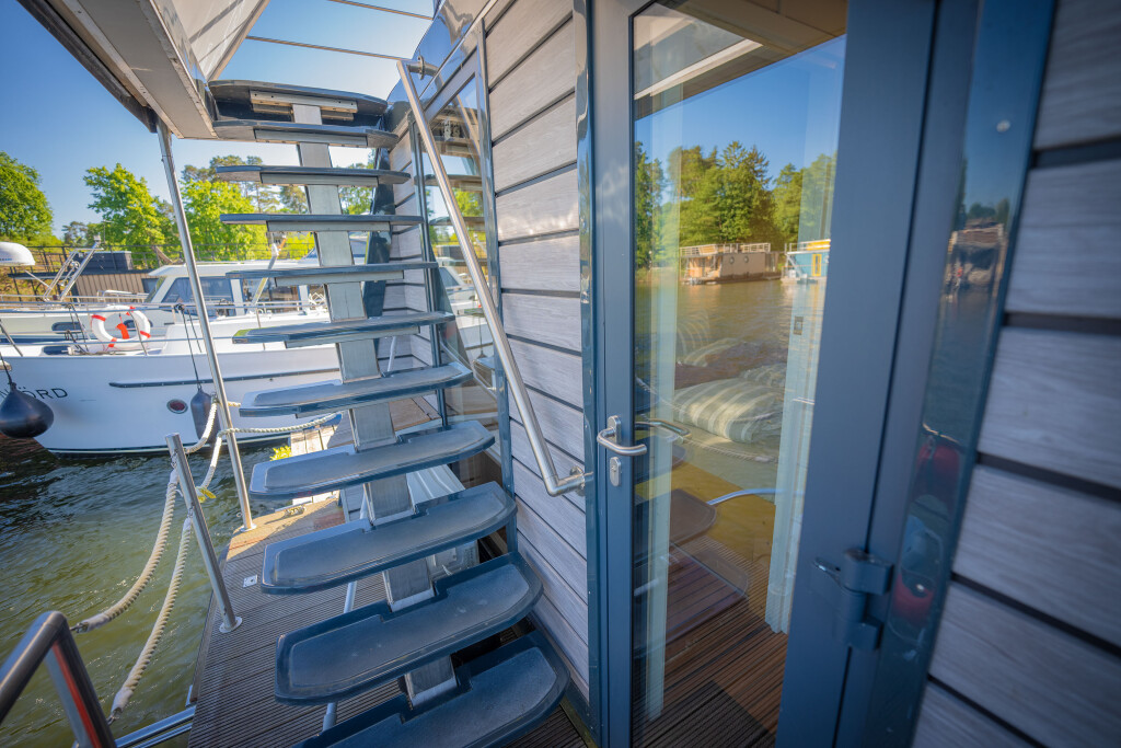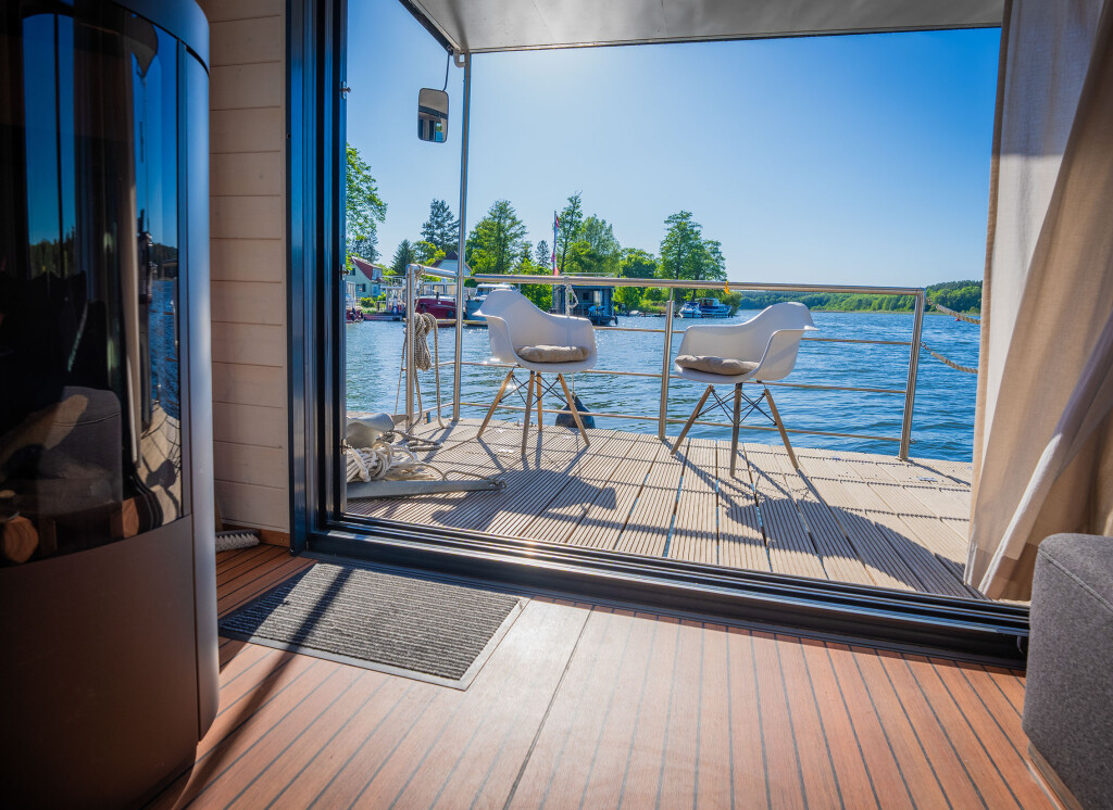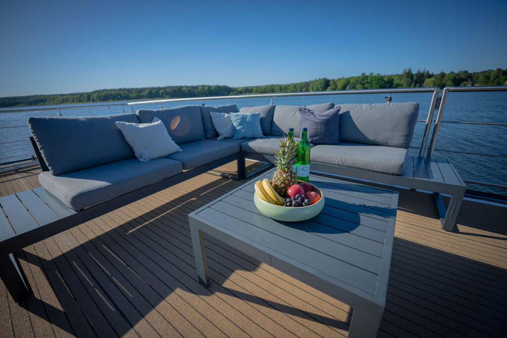 Hausboote Woma D13 Juno, Baujahr 2022, liegt im Röblinsee Marina, Brandenburg, Deutschland vor Anker. Es verfügt über 2 Kabinen und bietet Platz für 7 Personen mit 1 Toiletten. Bettwäsche und Küchenausstattung sind im Preis inbegriffen.