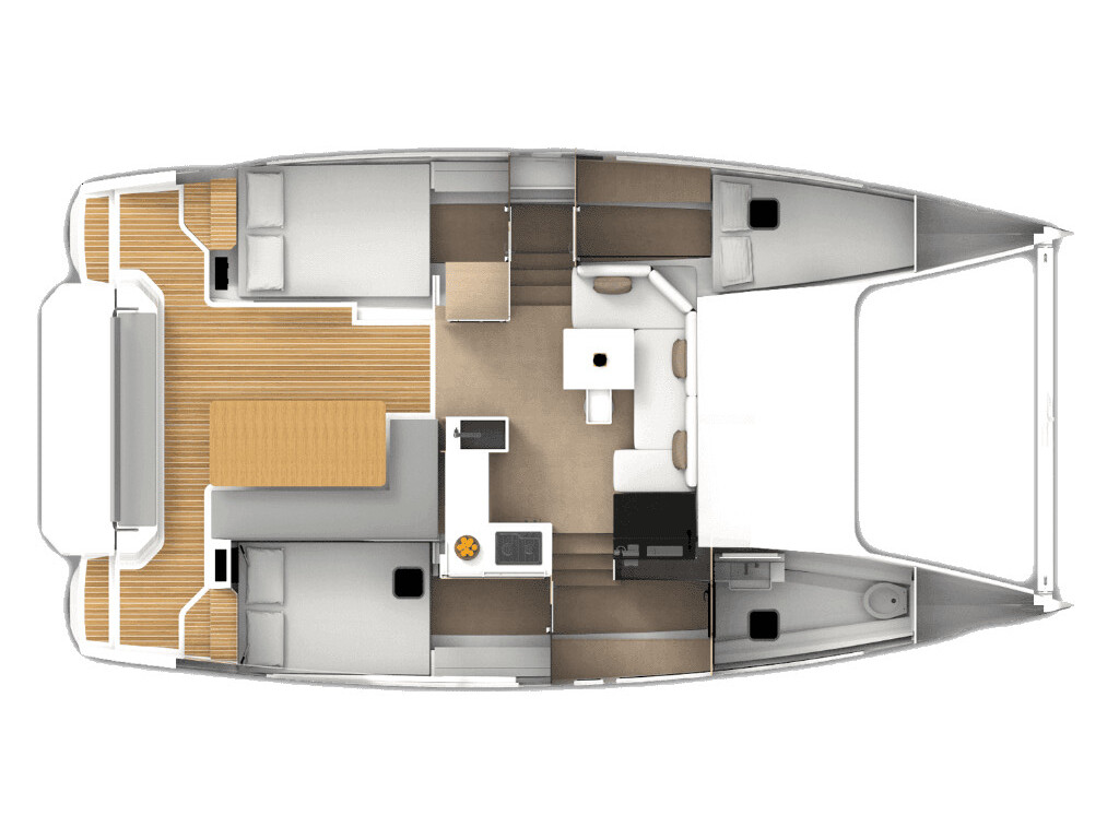 Catamaran Aventura 34 Marlon, built in 2022 is anchored in the Marina Kornati, Biograd, Croatia - Zadar, Croatia. It has 3 cabins, can accommodate 6 people and has 1 toilets. Bed linen and kitchen equipment are included in the price.