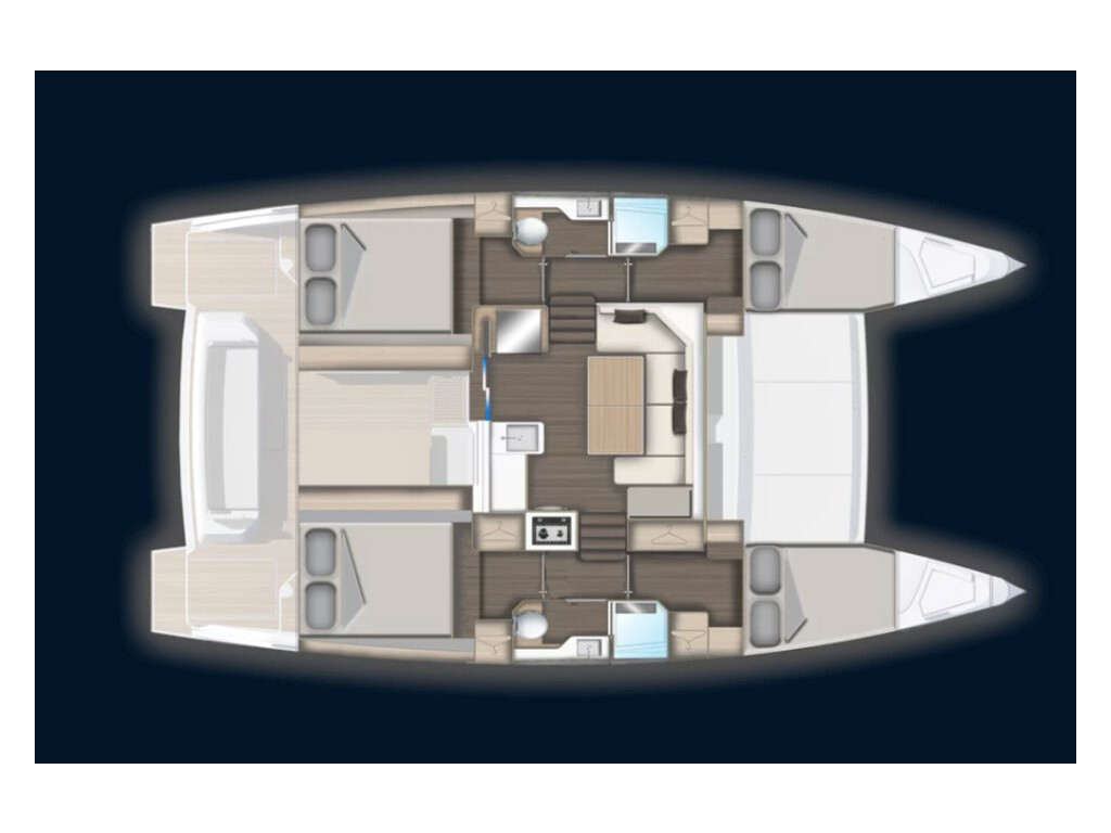 Catamaran Aventura 37 Pronto Sail, built in 2024 is anchored in the Fethiye, Yes Marina, Turkey - Aegean, Turkey. It has 4 cabins, can accommodate 8 people and has 2 toilets. Bed linen and kitchen equipment are included in the price.