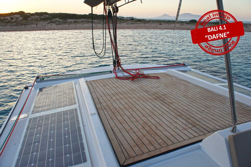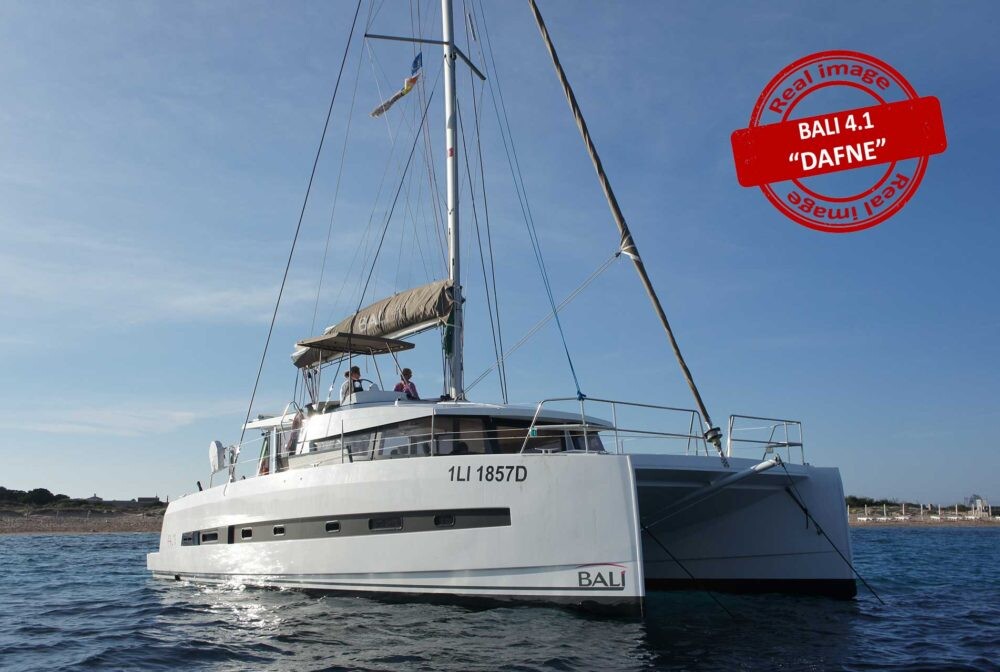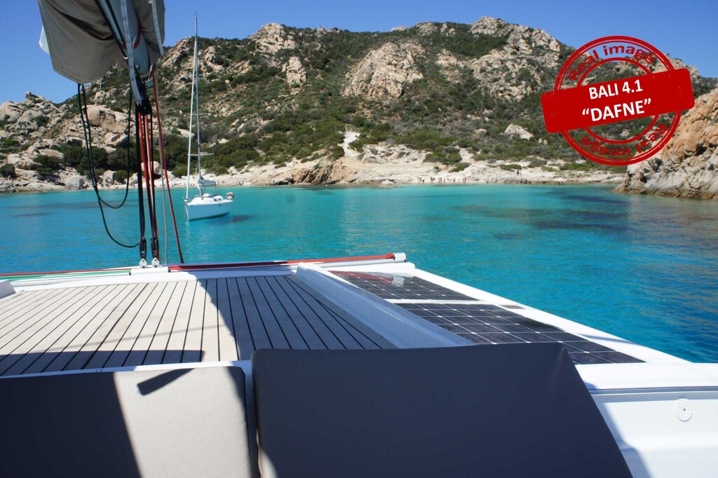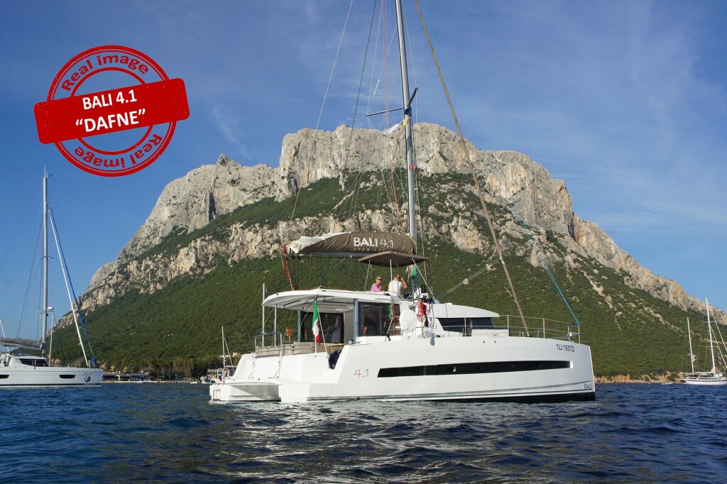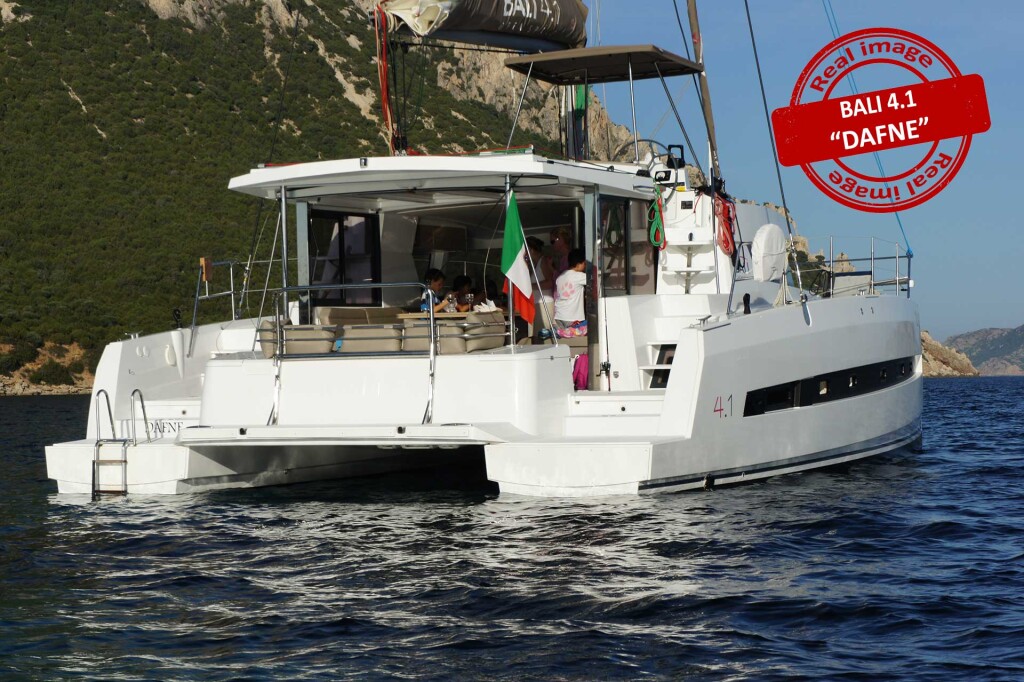 Catamaran Bali 4.1 Dafne, built in 2019 is anchored in the Sardinia, Cannigione, Italy - Sardinia, Italy. It has 4 + 2 cabins, can accommodate 8 + 2 people and has 4 toilets. Bed linen and kitchen equipment are included in the price.