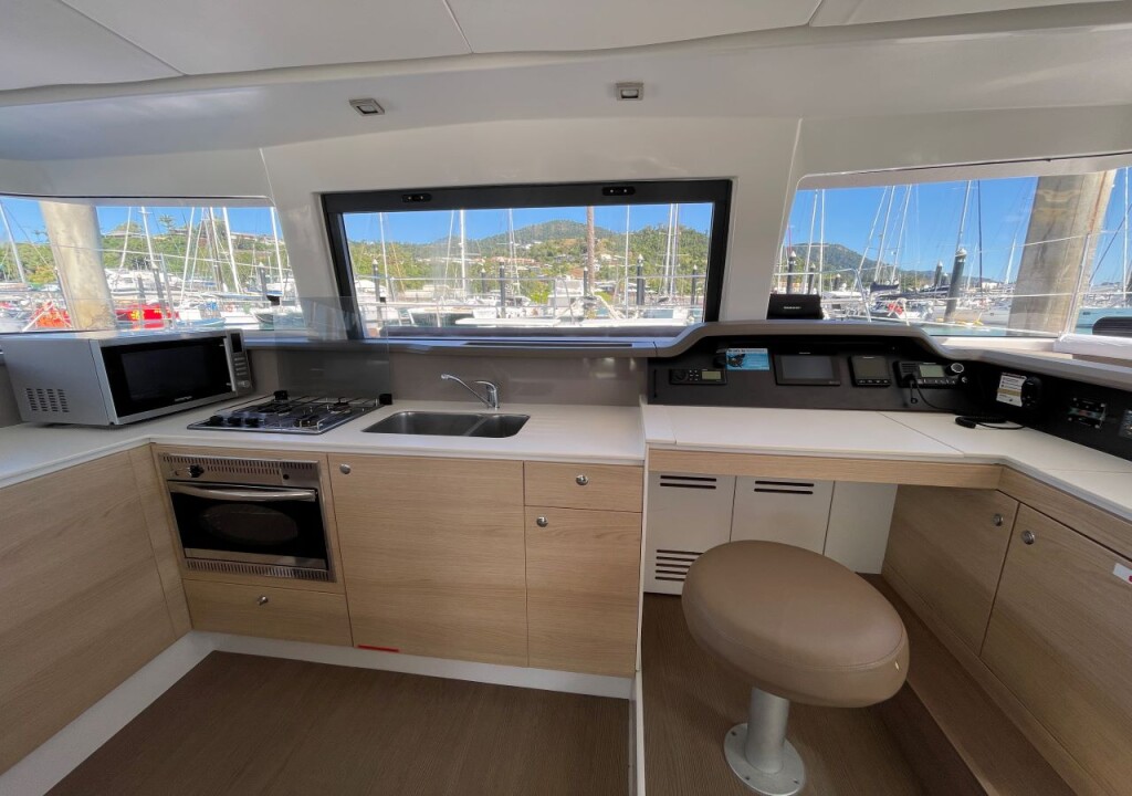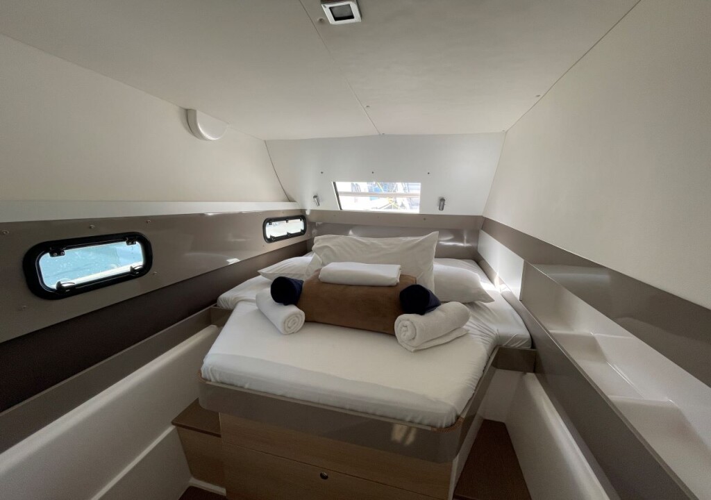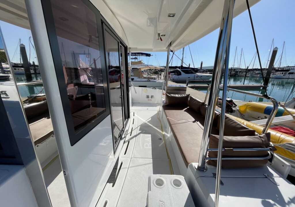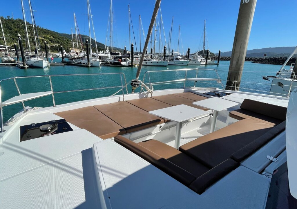 Catamaran Bali 4.1 NAMASTE_DB, built in 2019 is anchored in the Whitsundays, Airlie Beach, Coral Sea Marina, Australia - Whitsunday of Qeaunday, Australia and Oceania. It has 4 cabins, can accommodate 8 people and has 4 toilets. Bed linen and kitchen equipment are included in the price.