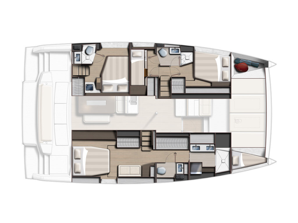Catamaran Bali 4.6 Brain, built in 2024 is anchored in the Trogir, Yachtclub Seget (Marina Baotić), Croatia - Split, Croatia. It has 4 + 1 cabins, can accommodate 8 + 1 people and has 3 toilets. Bed linen and kitchen equipment are included in the price.