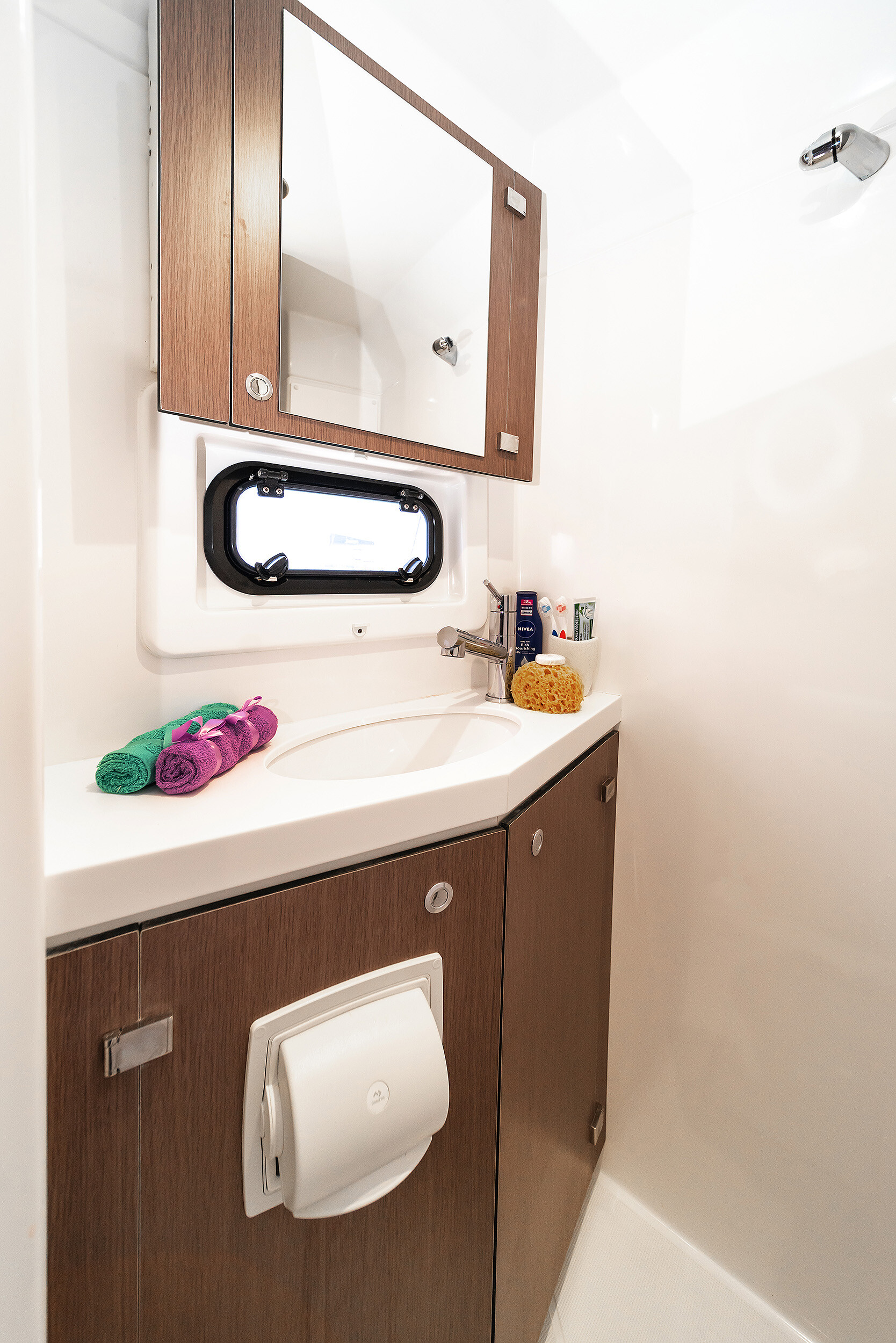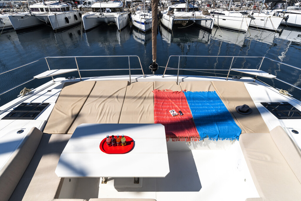 Catamaran Bali 4.8 About Time, built in 2021 is anchored in the Athens, Alimos marina, Greece - Peloponnese, Greece. It has 6 + 1 cabins, can accommodate 12 people and has 6 + 1 toilets. Bed linen and kitchen equipment are included in the price.