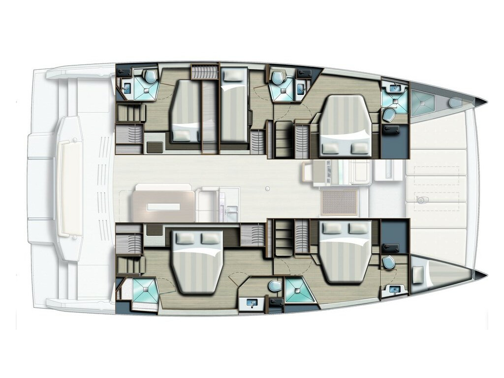 Catamaran Bali 4.8 Eagle, built in 2022 is anchored in the Lavrion, main port, Greece - Peloponnese, Greece. It has 5 + 2 cabins, can accommodate 10 + 2 people and has 5 toilets. Bed linen and kitchen equipment are included in the price.