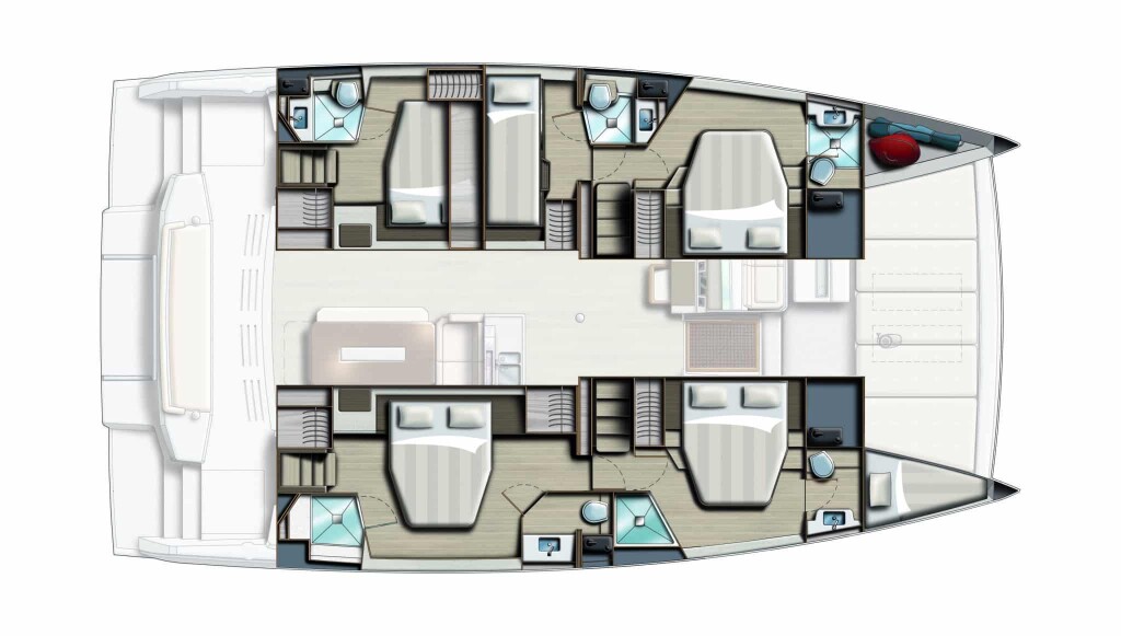 Catamaran Bali 4.8 Oksy, built in 2024 is anchored in the Lavrion, main port, Greece - Peloponnese, Greece. It has 5 + 2 cabins, can accommodate 10 + 2 people and has 5 toilets. Bed linen and kitchen equipment are included in the price.