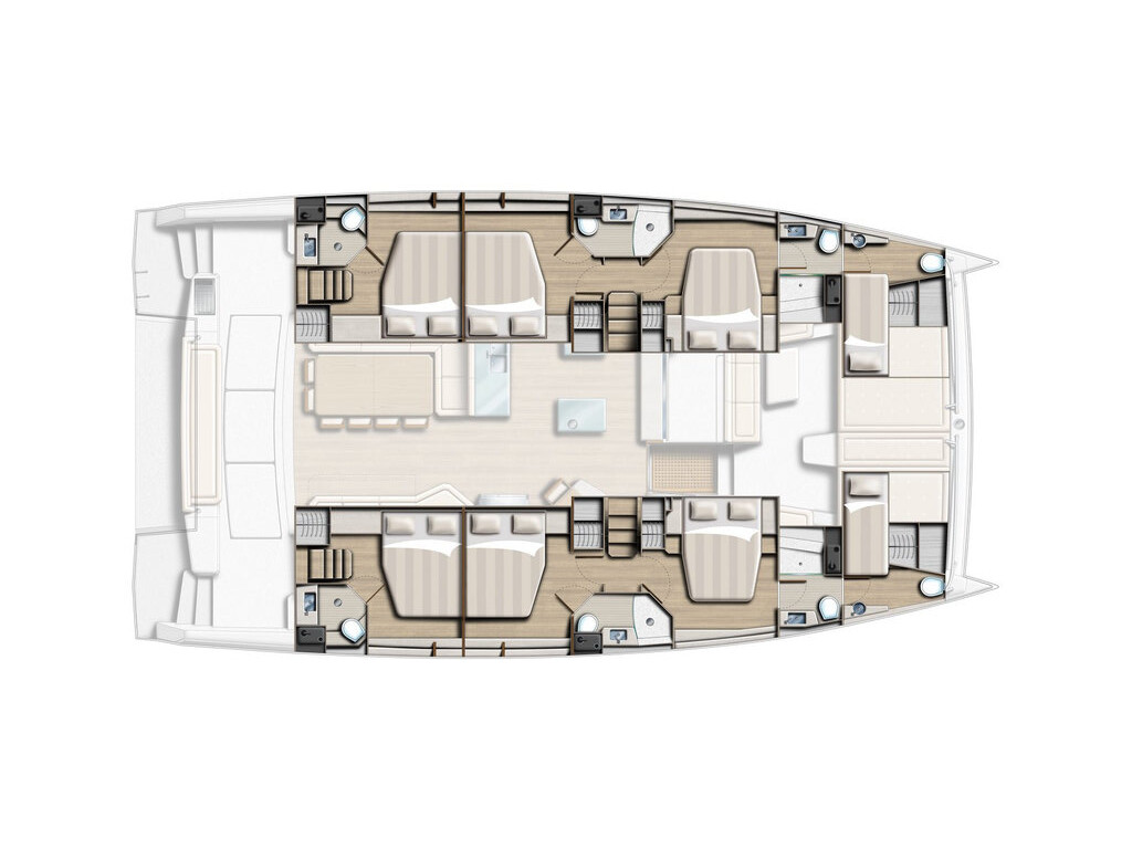Catamaran Bali 5.4 Lalounge, built in 2019 is anchored in the Marina Frapa, Rogoznica, Croatia - Sibenik, Croatia. It has 6 + 2 cabins, can accommodate 12 + 1 + 1 people and has 8 toilets. Bed linen and kitchen equipment are included in the price.