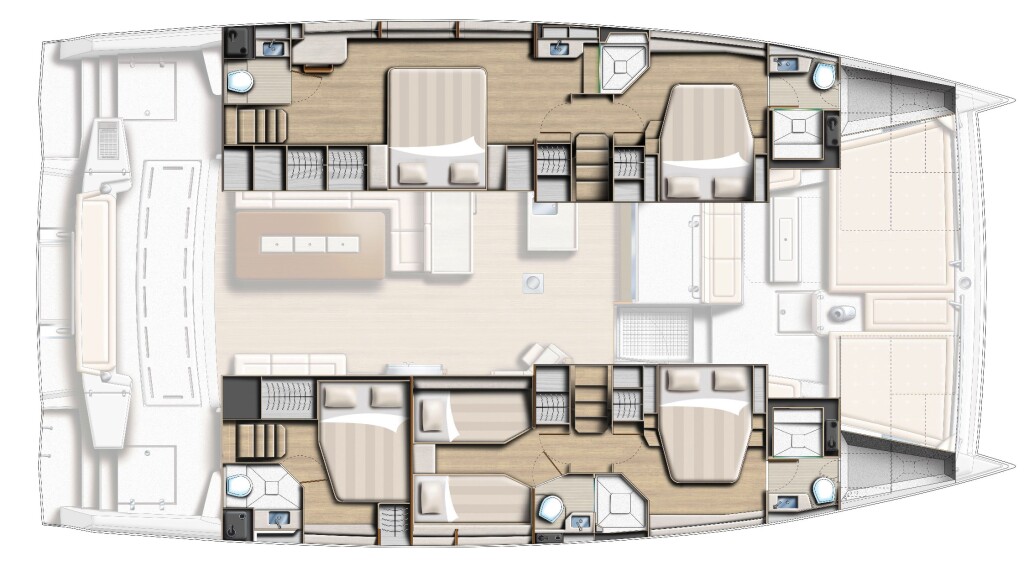 Catamaran Bali 5.4 License to Chill (crewed), built in 2019 is anchored in the Athens, Alimos marina, Greece - Peloponnese, Greece. It has 5 + 2 cabins, can accommodate 10 + 2 people and has 5 + 2 toilets. Bed linen and kitchen equipment are included in the price.