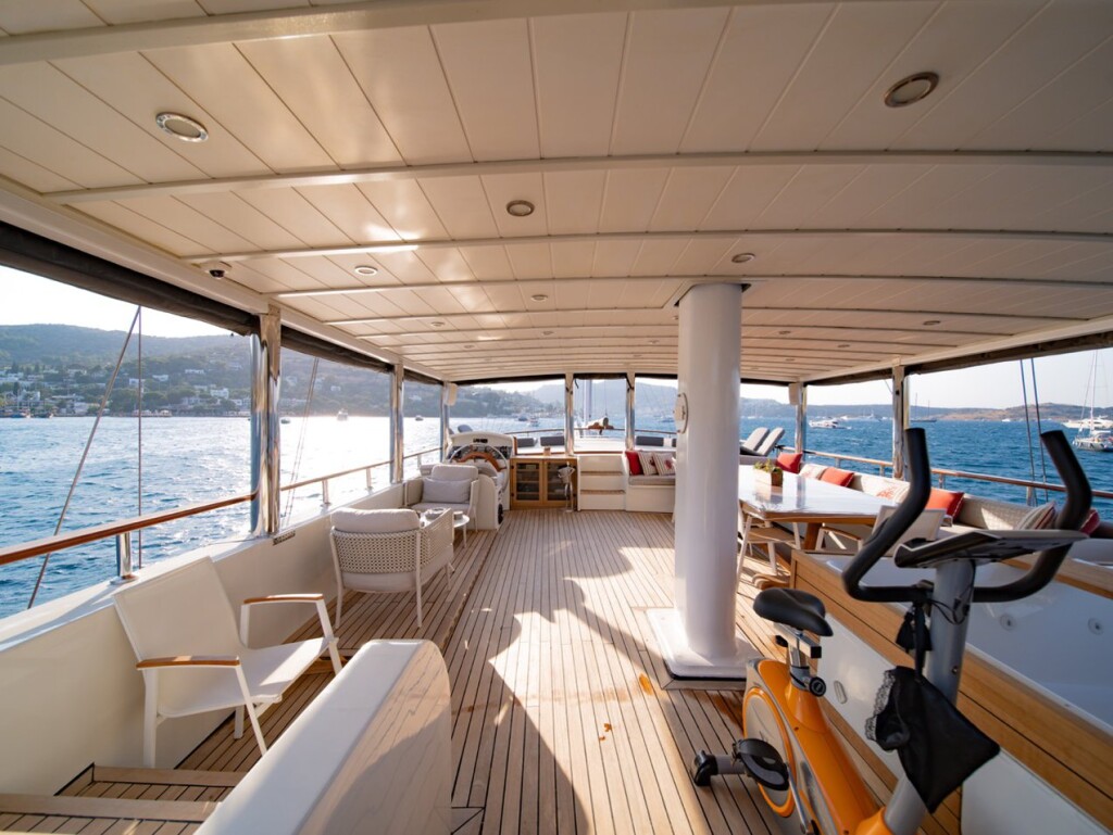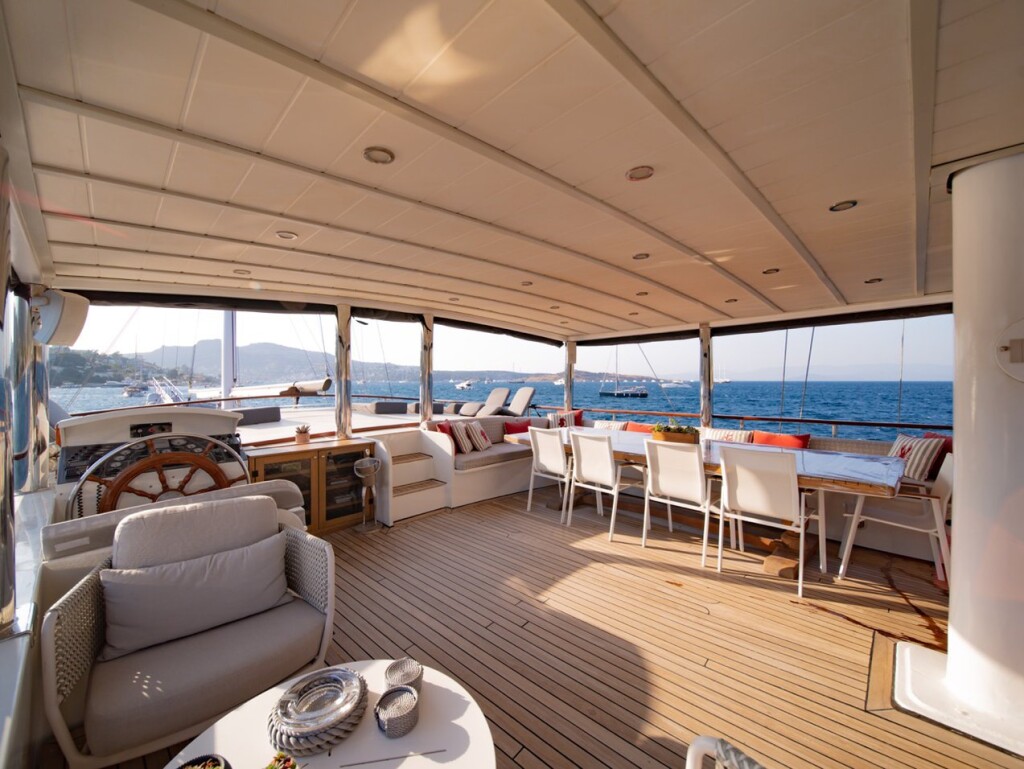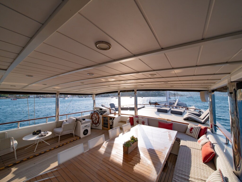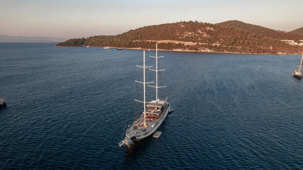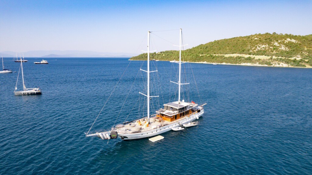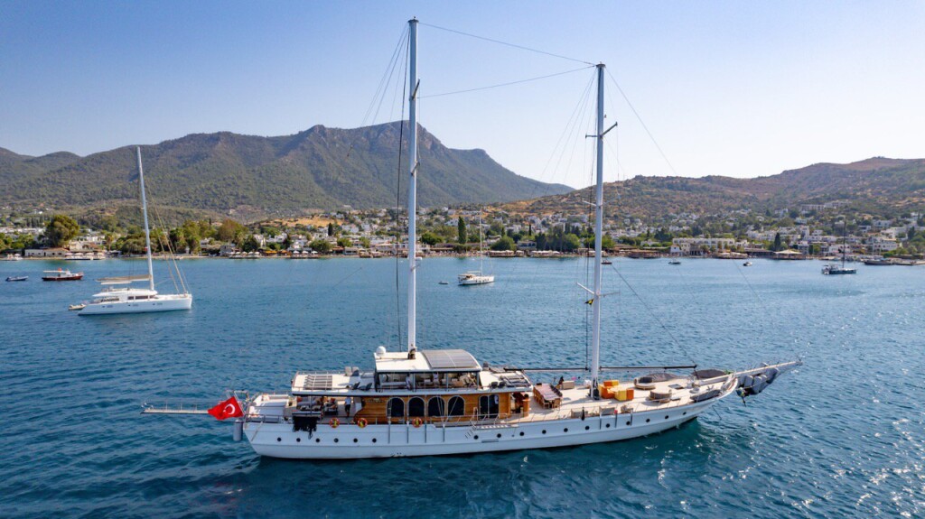 Motorsailer Caustic Caustic, built in 2007 is anchored in the Bodrum Harbour, Turkey - Aegean, Turkey. It has 6 + 3 cabins, can accommodate 12 + 6 people and has 6 toilets. Bed linen and kitchen equipment are included in the price.