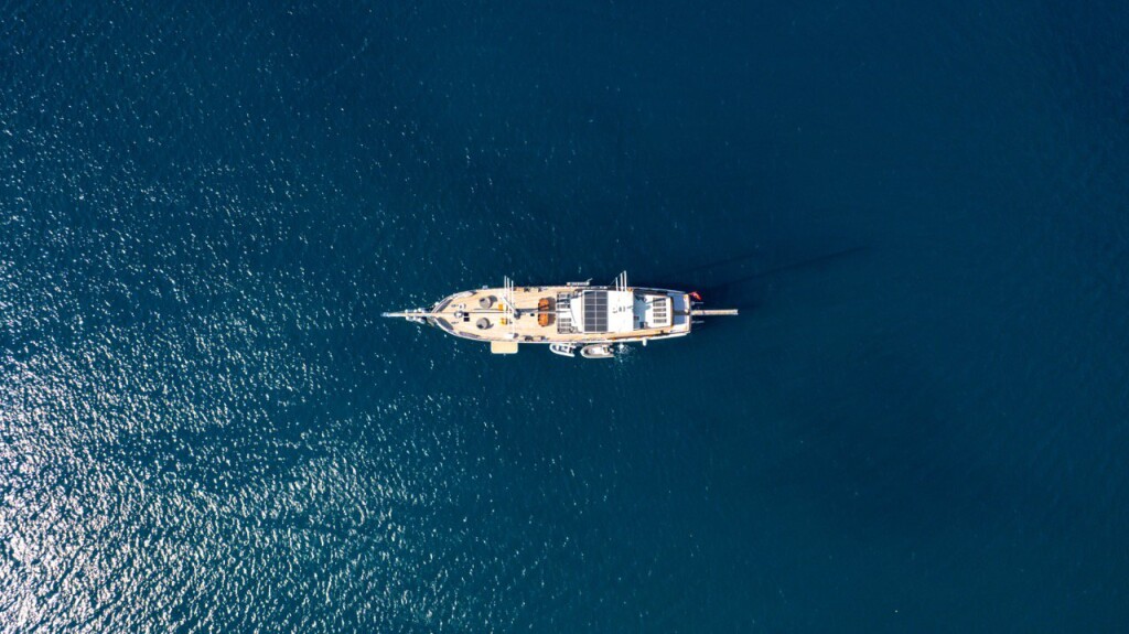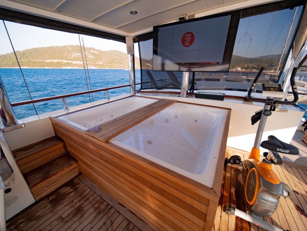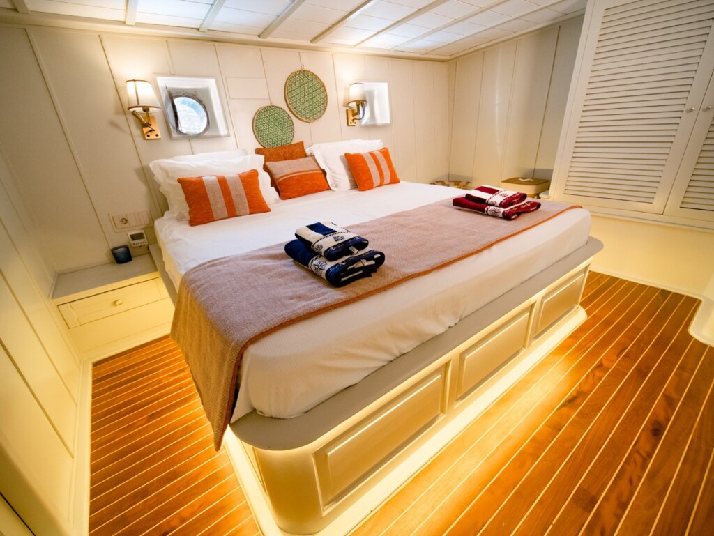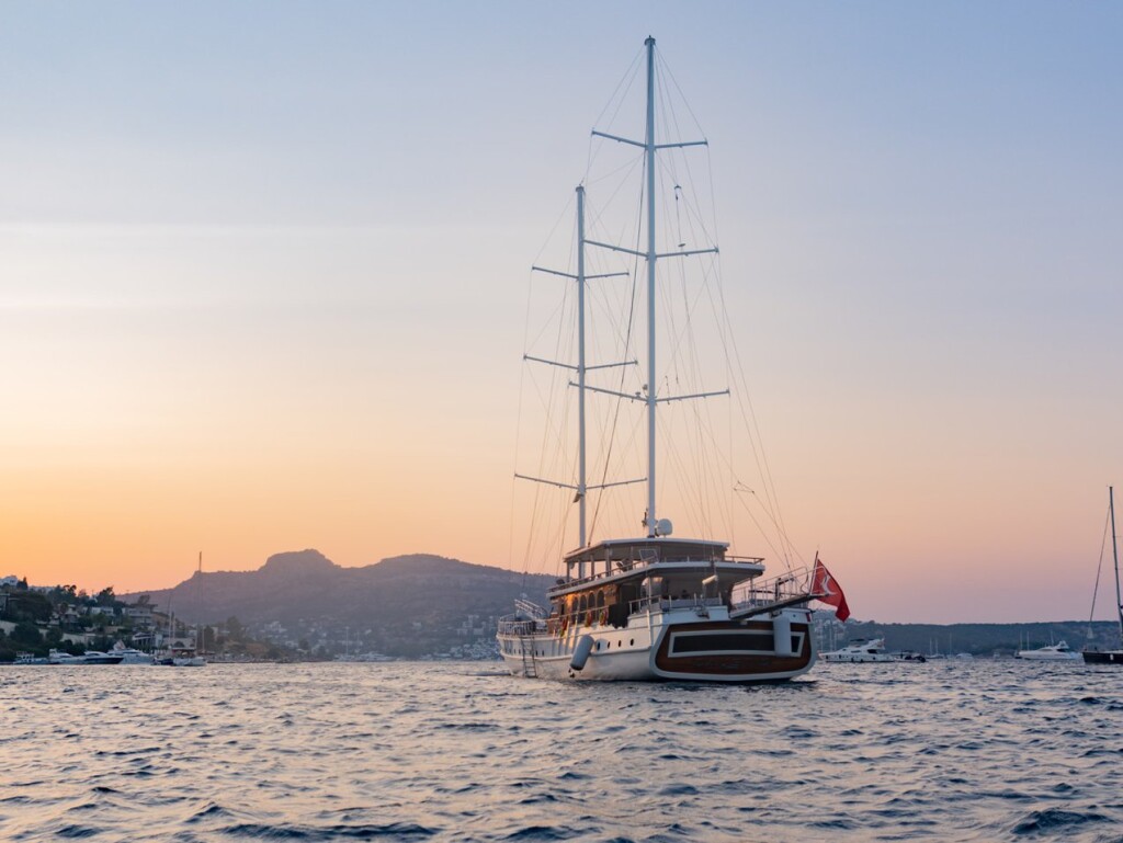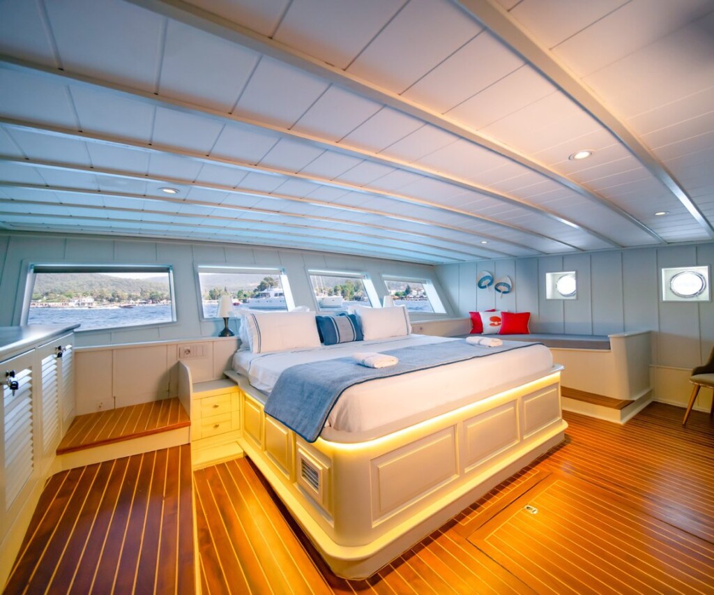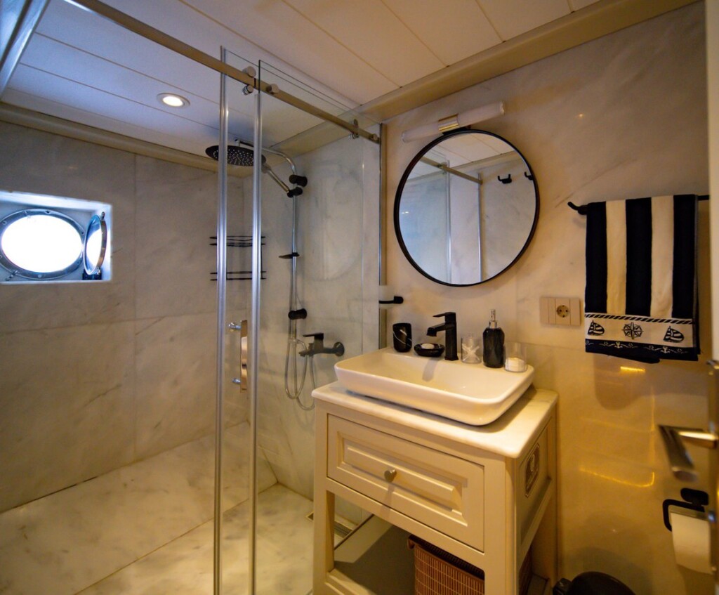 Motorsailer Caustic Caustic, built in 2007 is anchored in the Bodrum Harbour, Turkey - Aegean, Turkey. It has 6 + 3 cabins, can accommodate 12 + 6 people and has 6 toilets. Bed linen and kitchen equipment are included in the price.