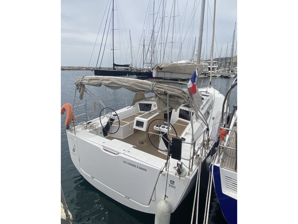Sailing yacht Dufour 390 GL Les Copains D'abord, built in 2020 is anchored in the Marseille, Corbières Port Services, France - Cote dAzur, France. It has 3 cabins, can accommodate 6 + 2 people and has 2 toilets. Bed linen and kitchen equipment are included in the price.