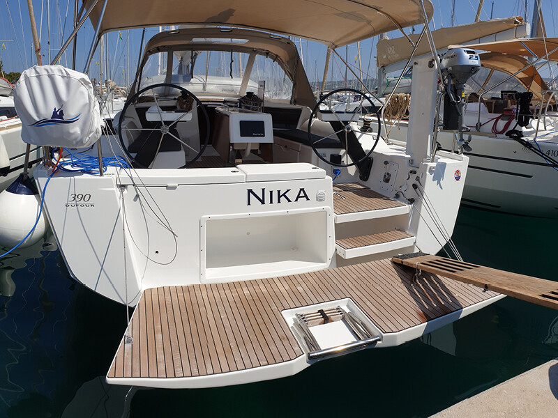 The Dufour 390 GL is particularly popular due to its special equipment such as Life jackets, Inverter, Cockpit cushions, Solar panels, Teak cockpit, Bathing platform, Autopilot, Bow thruster, Cockpit grill, Wi-Fi Internet. If you have any questions, our team will be happy to answer them personally!