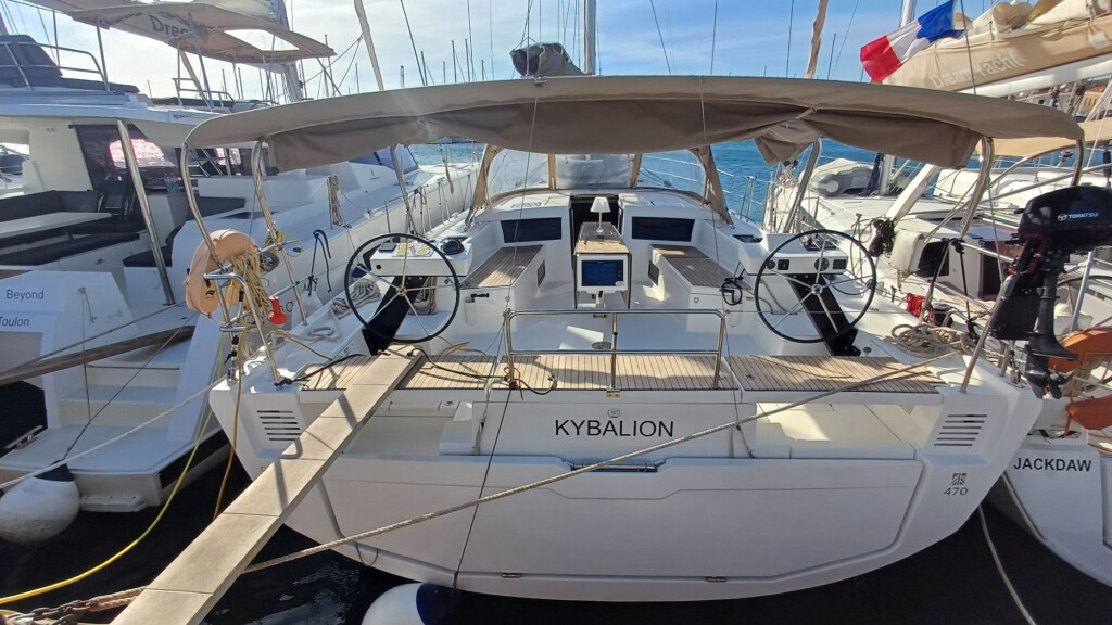 Sailing yacht Dufour 470 KYBALION, built in 2023 is anchored in the Lavrion, main port, Greece - Peloponnese, Greece. It has 4 + 1 cabins, can accommodate 8 + 2 + 1 people and has 4 toilets. Bed linen and kitchen equipment are included in the price.