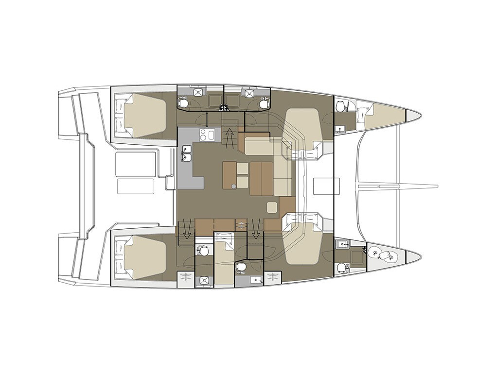 Catamaran Dufour 48 Catamaran Danai, built in 2023 is anchored in the Mykonos, Greece - Cyclades, Greece. It has 5 + 1 cabins, can accommodate 10 + 2 people and has 5 + 1 toilets. Bed linen and kitchen equipment are included in the price.