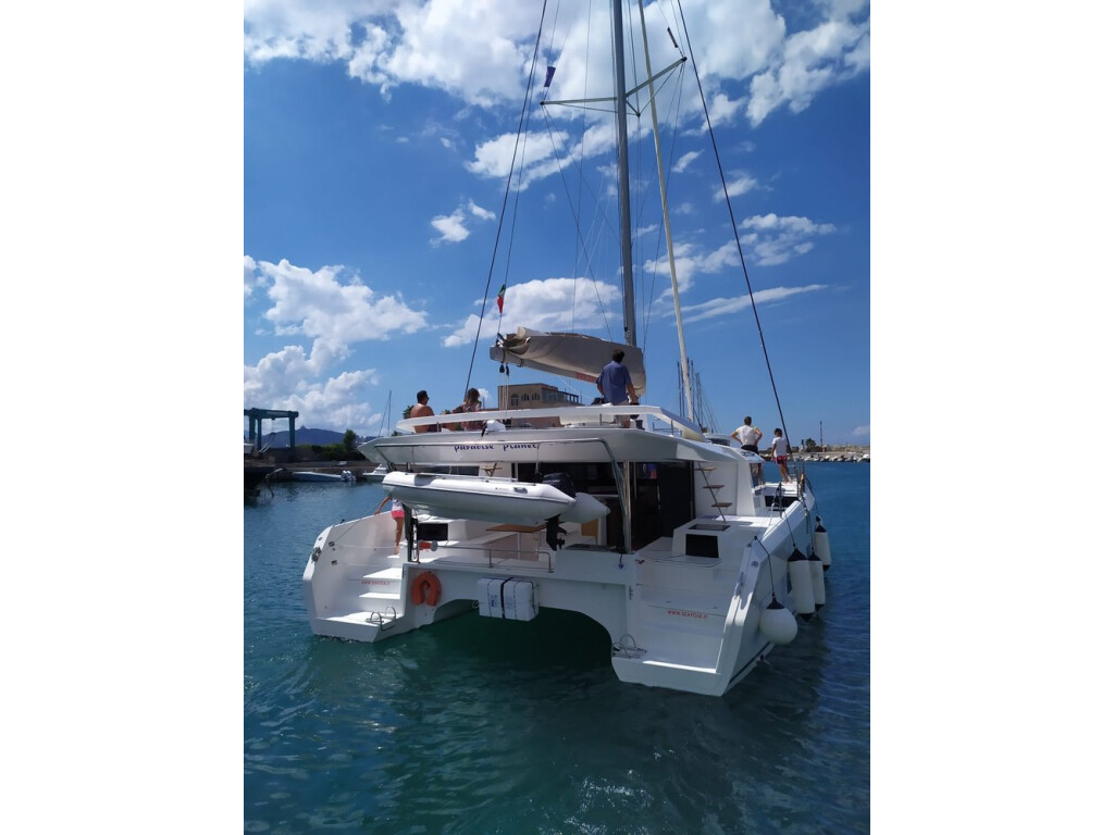 Catamaran Dufour 48 Catamaran Paradise Planet, built in 2020 is anchored in the Marsala, Italy - Sicily, Italy. It has 5 + 1 cabins, can accommodate 10 + 2 + 2 people and has 5 toilets. Bed linen and kitchen equipment are included in the price.