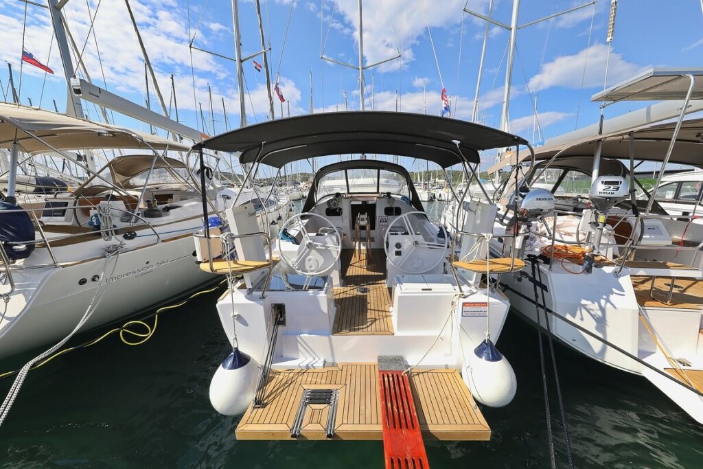 Sailing yacht Elan Impression 40.1 Valata, built in 2022 is anchored in the Marina Pirovac, Croatia - Sibenik, Croatia. It has 3 cabins, can accommodate 6 + 2 people and has 2 toilets. Bed linen and kitchen equipment are included in the price.