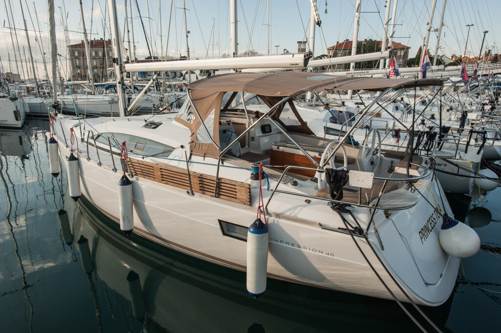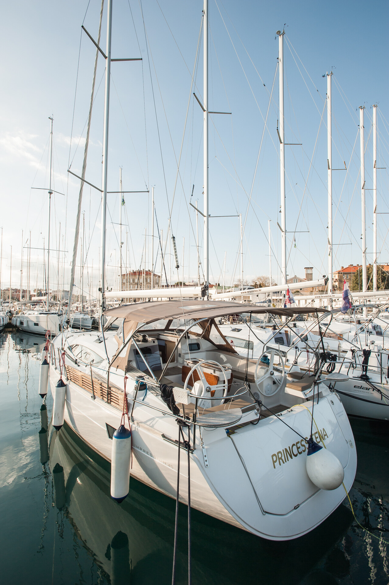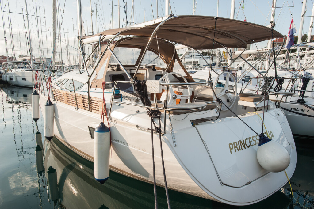 Sailing yacht Elan Impression 45 Princess Tena, built in 2017 is anchored in the Marina Zadar (ex. Tankerkomerc), Croatia - Zadar, Croatia. It has 4 cabins, can accommodate 8 + 2 people and has 2 toilets. Bed linen and kitchen equipment are included in the price.