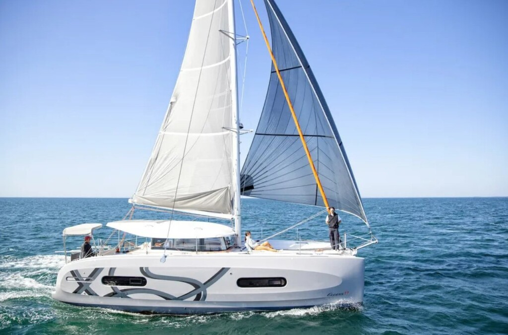 Catamaran Excess 11 Axieros II, built in 2023 is anchored in the Lefkas main port, Greece - Ionian Islands, Greece. It has 4 + 1 cabins, can accommodate 10 people and has 2 + 1 toilets. Bed linen and kitchen equipment are included in the price.