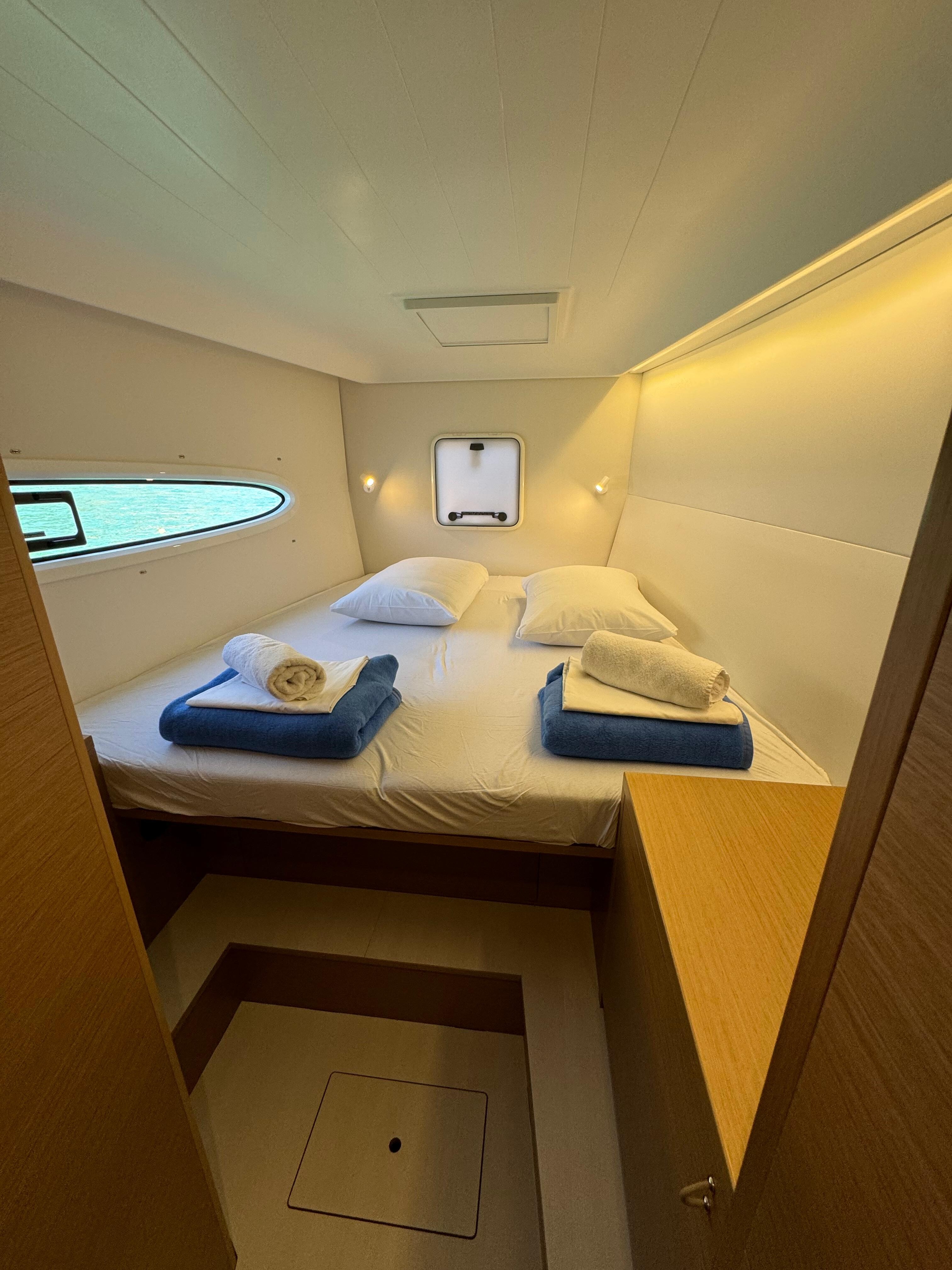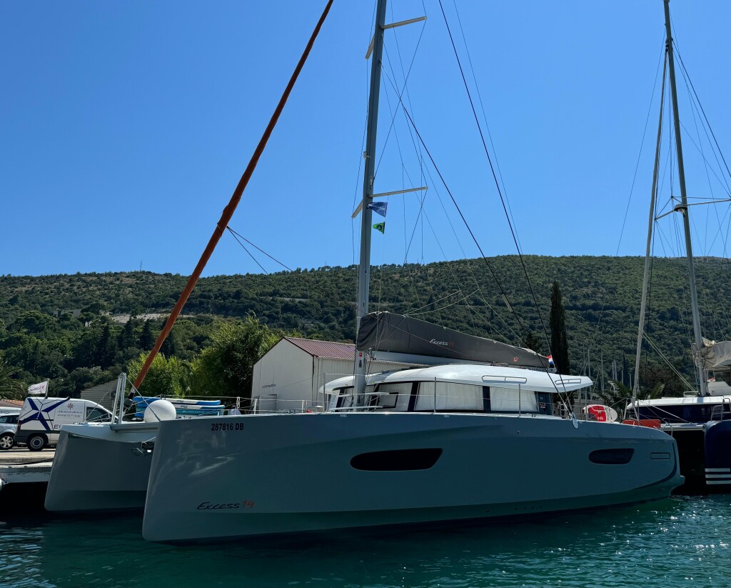 Catamaran Excess 14 Blue Kiss, built in 2024 is anchored in the Dubrovnik, Komolac, ACI Marina Dubrovnik, Croatia - Dubrovnik, Croatia. It has 4 + 2 cabins, can accommodate 8 + 2 + 2 people and has 4 toilets. Bed linen and kitchen equipment are included in the price.