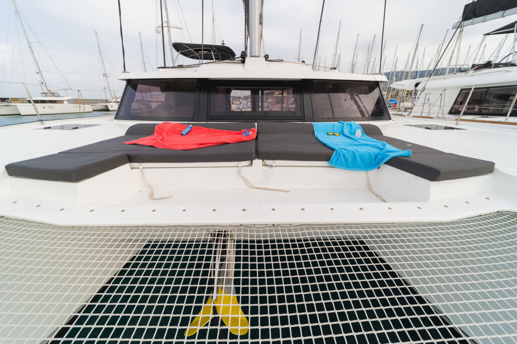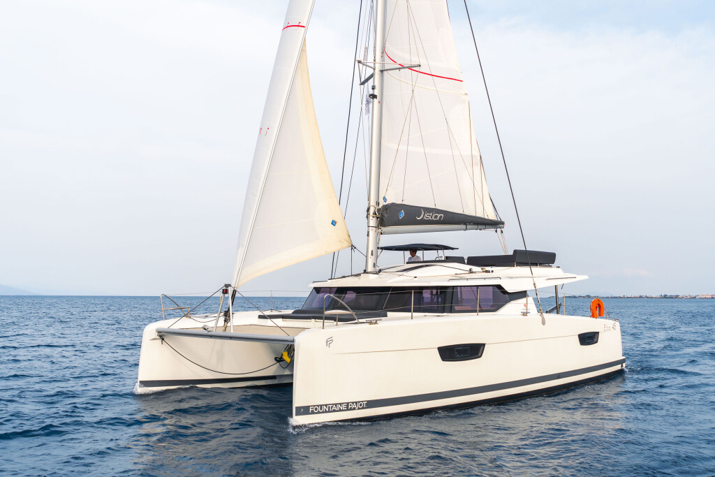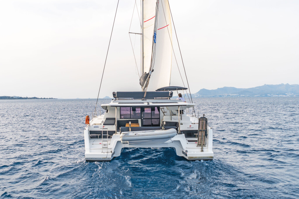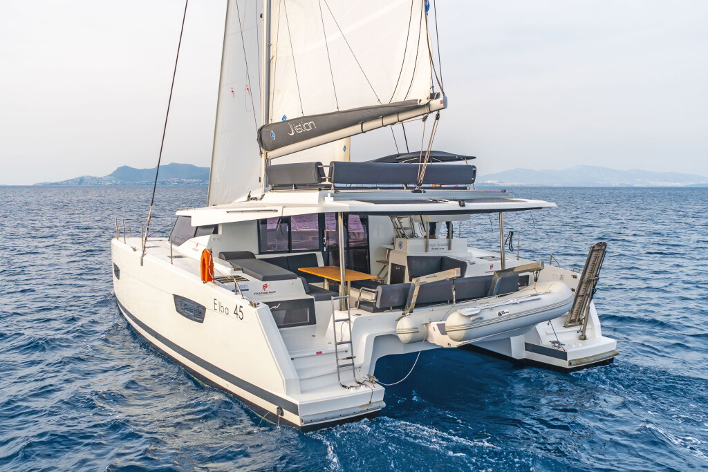 Catamaran Fountaine Pajot Elba 45 Night Breeze, built in 2021 is anchored in the Kos, Kos Marina, Greece - Dodecanese, Greece. It has 4 + 2 cabins, can accommodate 8 + 2 people and has 4 toilets. Bed linen and kitchen equipment are included in the price.