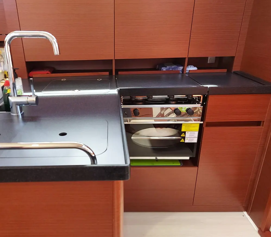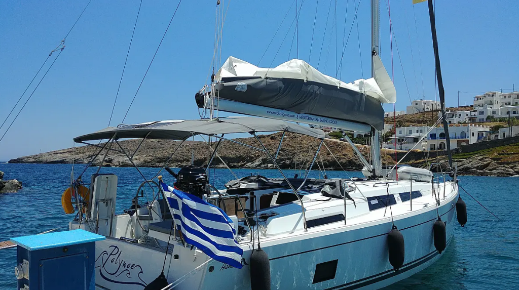 Sailing yacht Hanse 418 Polynoe, built in 2021 is anchored in the Lavrion - Olympic Marine, Greece - Peloponnese, Greece. It has 3 cabins, can accommodate 6 + 2 people and has 2 toilets. Bed linen and kitchen equipment are included in the price.