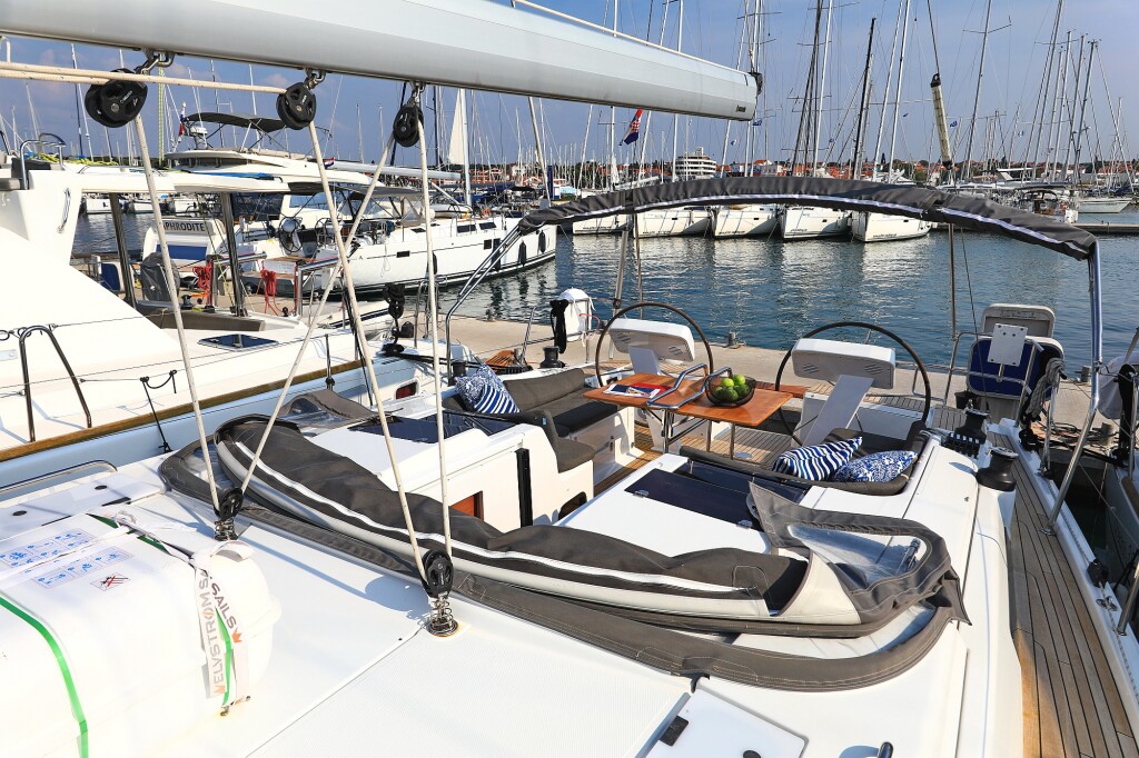 Sailing yacht Hanse 458 Amarena, built in 2020 is anchored in the Sukosan, D-Marin Dalmacija Marina, Croatia - Zadar, Croatia. It has 3 cabins, can accommodate 6 + 2 people and has 2 toilets. Bed linen and kitchen equipment are included in the price.