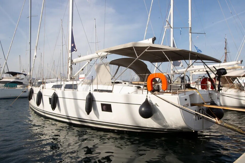 Sailing yacht Hanse 508 Medusa II, built in 2021 is anchored in the Lefkas main port, Greece - Ionian Islands, Greece. It has 5 + 1 cabins, can accommodate 10 + 1 + 1 people and has 3 + 1 toilets. Bed linen and kitchen equipment are included in the price.
