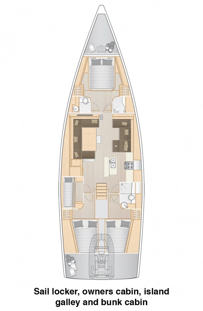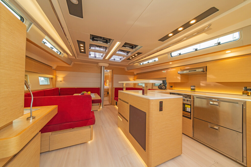 Sailing yacht Hanse 588 Amadea, built in 2020 is anchored in the Kos, Kos Marina, Greece - Dodecanese, Greece. It has 3 + 1 cabins, can accommodate 6 + 1 people and has 3 + 1 toilets. Bed linen and kitchen equipment are included in the price.