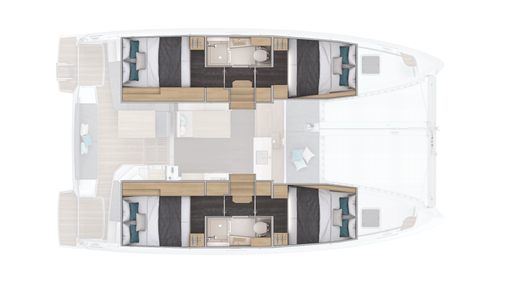 Catamaran Lagoon 38 Merkourios, built in 2026 is anchored in the Lefkas main port, Greece - Ionian Islands, Greece. It has 4 cabins, can accommodate 8 people and has 2 toilets. Bed linen and kitchen equipment are included in the price.