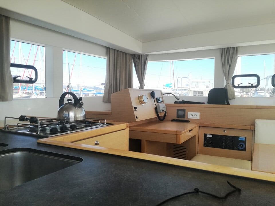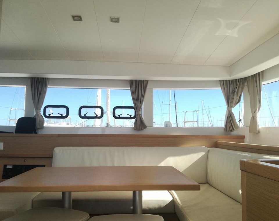 Catamaran Lagoon 39 Deep Blue, built in 2016 is anchored in the Lefkas main port, Greece - Ionian Islands, Greece. It has 4 + 2 cabins, can accommodate 8 + 2 people and has 4 toilets. Bed linen and kitchen equipment are included in the price.