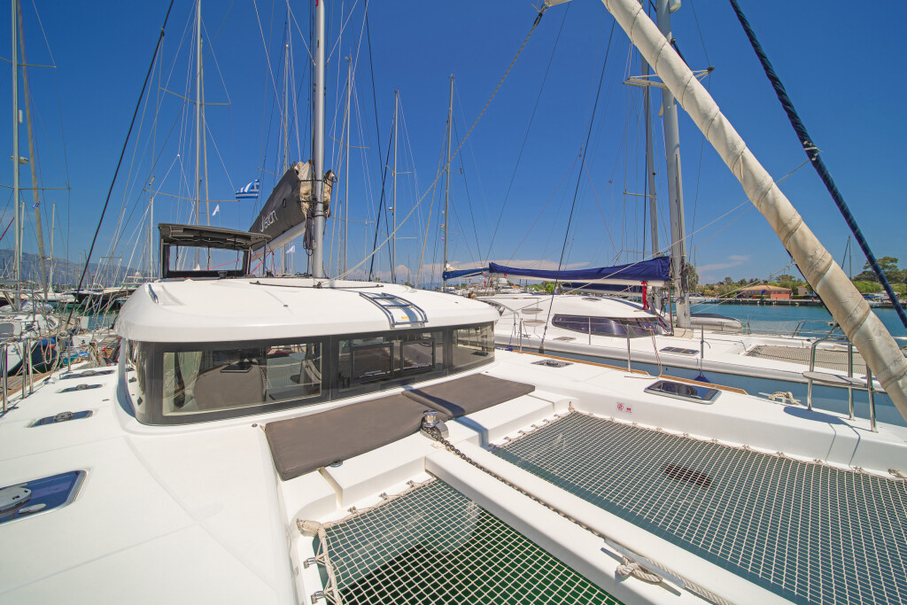 Catamaran Lagoon 40 Nemo, built in 2023 is anchored in the Rhodes New Marina, Greece - Dodecanese, Greece. It has 4 + 2 cabins, can accommodate 8 + 2 + 2 people and has 4 + 1 toilets. Bed linen and kitchen equipment are included in the price.