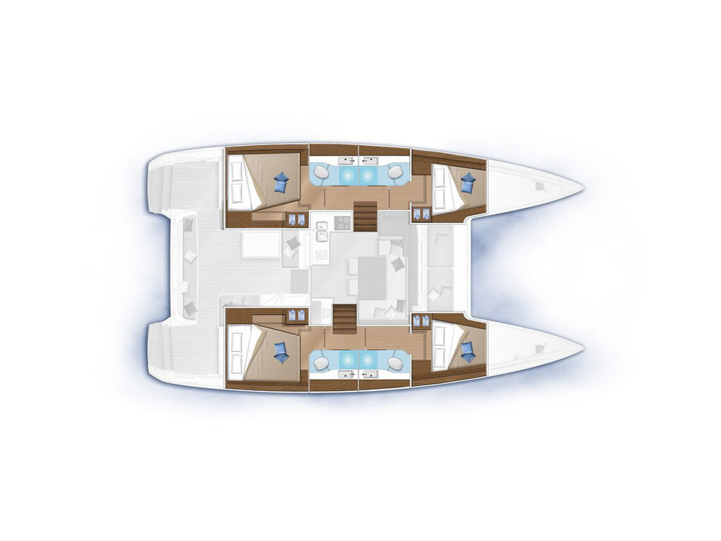 Catamaran Lagoon 42 Tethys, built in 2020 is anchored in the Lefkas, D-Marin, Greece - Ionian Islands, Greece. It has 4 + 2 cabins, can accommodate 8 + 2 people and has 4 toilets. Bed linen and kitchen equipment are included in the price.