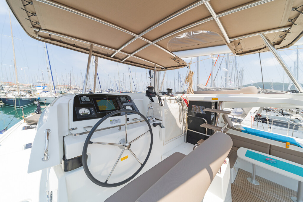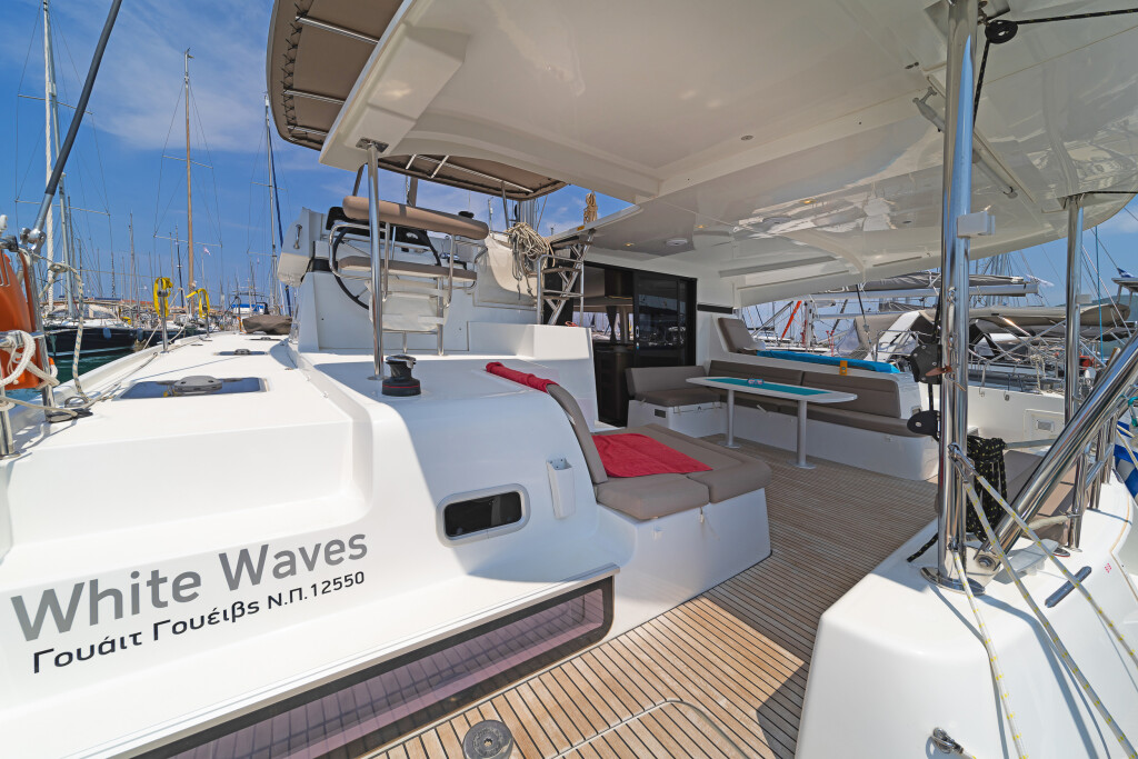 Catamaran Lagoon 42 White Waves, built in 2020 is anchored in the Lefkas, D-Marin, Greece - Ionian Islands, Greece. It has 4 + 2 cabins, can accommodate 8 + 2 people and has 4 + 1 toilets. Bed linen and kitchen equipment are included in the price.