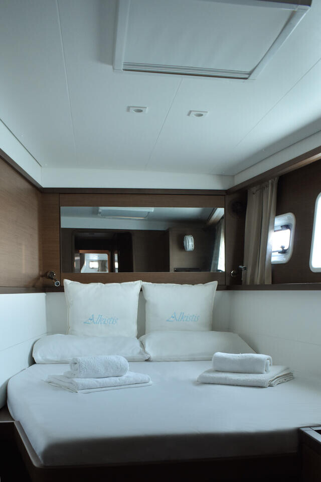 Catamaran Lagoon 450 F Alkistis, built in 2019 is anchored in the Athens, Alimos marina, Greece - Peloponnese, Greece. It has 4 + 2 cabins, can accommodate 8 + 2 + 2 people and has 4 + 1 toilets. Bed linen and kitchen equipment are included in the price.