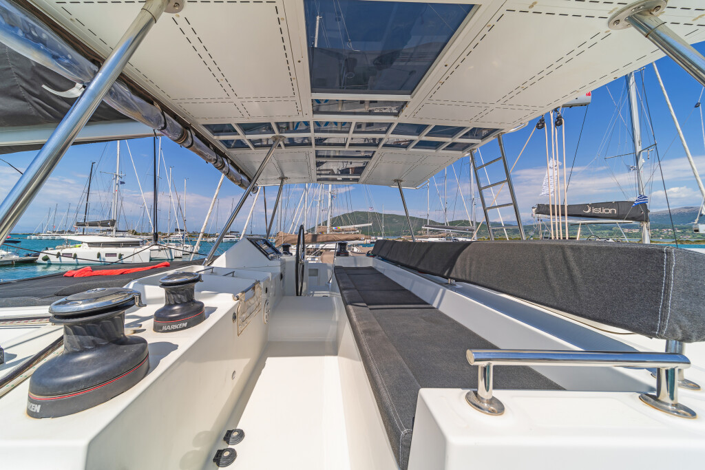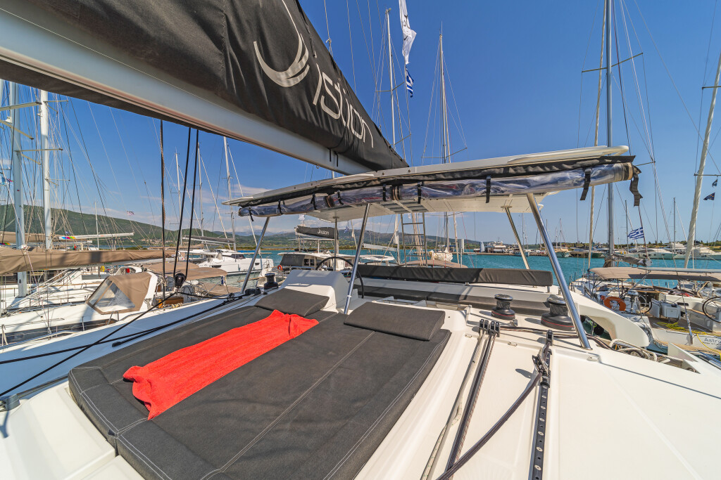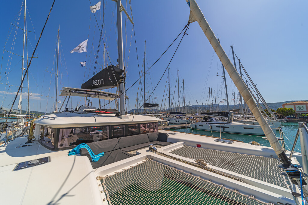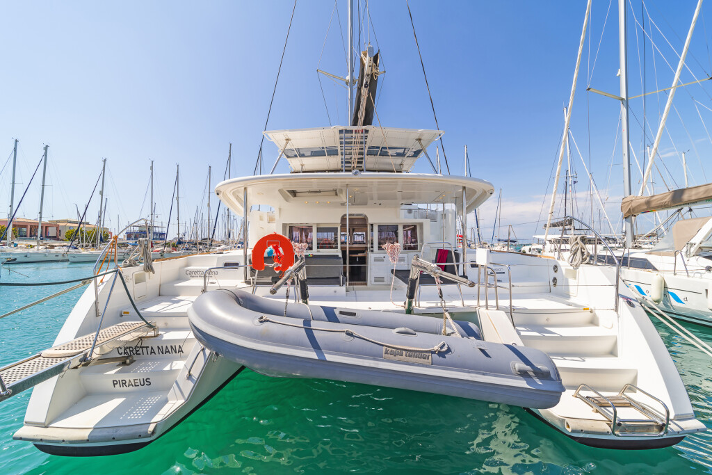 Catamaran Lagoon 450 F Caretta Nana, built in 2019 is anchored in the Lefkas, D-Marin, Greece - Ionian Islands, Greece. It has 4 + 2 cabins, can accommodate 8 + 2 people and has 4 toilets. Bed linen and kitchen equipment are included in the price.